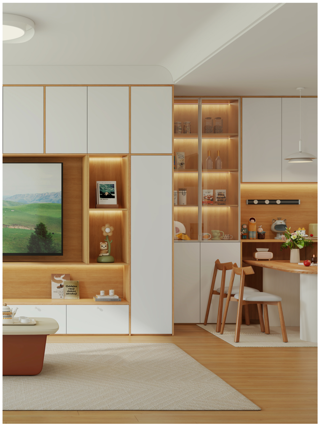 整墻餐邊柜搭配嵌入式餐桌??? 用餐儲物一體,過道暢通無阻;開放式廚房定制臺面,備餐、小酌、輕辦公皆可,高效利用空間?