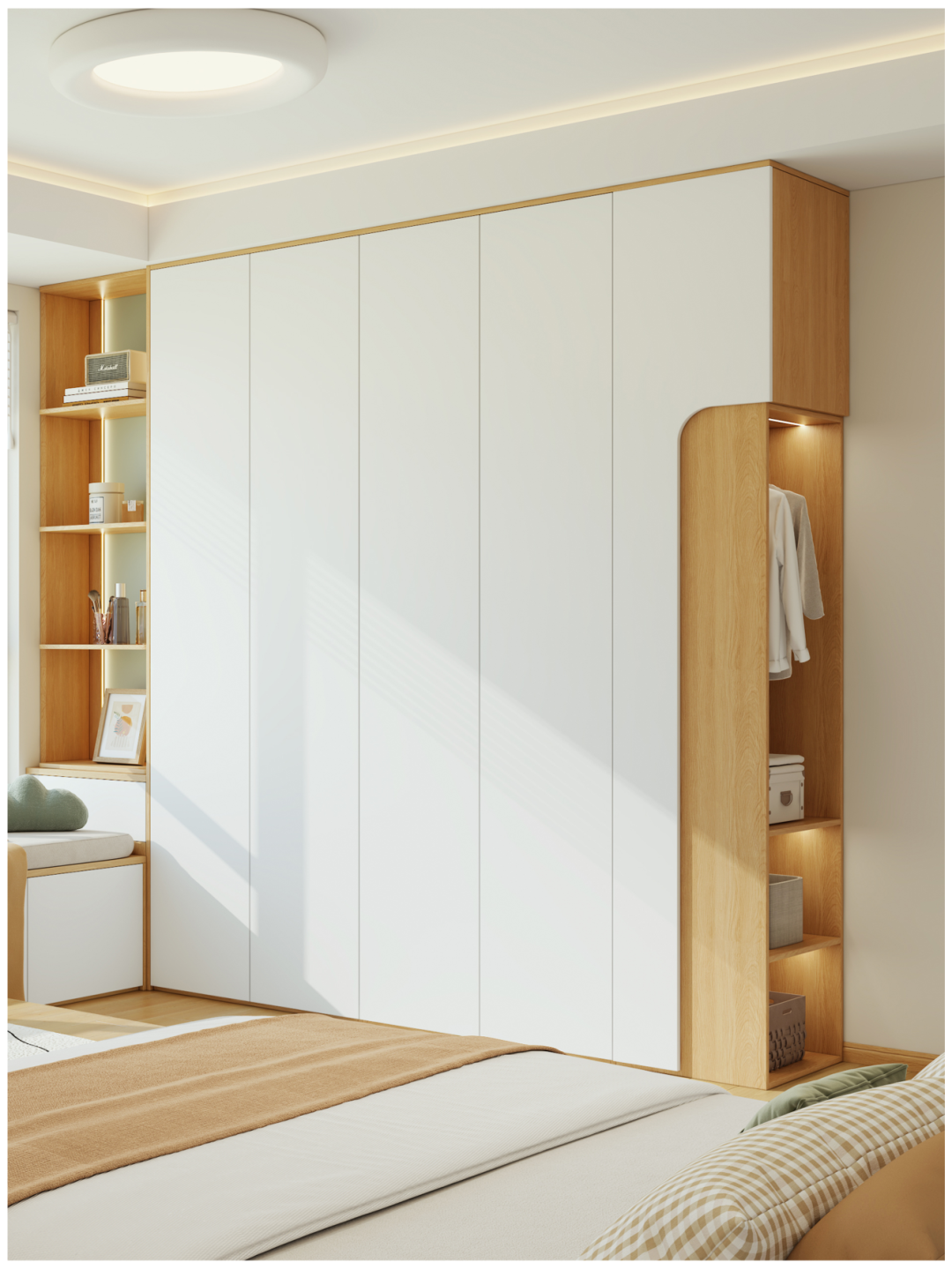 衣柜+飄窗卡座+儲物柜一體定制,整體性強又不失美感;衣柜側面設計開放格,打造次凈衣區??地臺床設計巧妙劃分空間,安全感與氛圍感并存