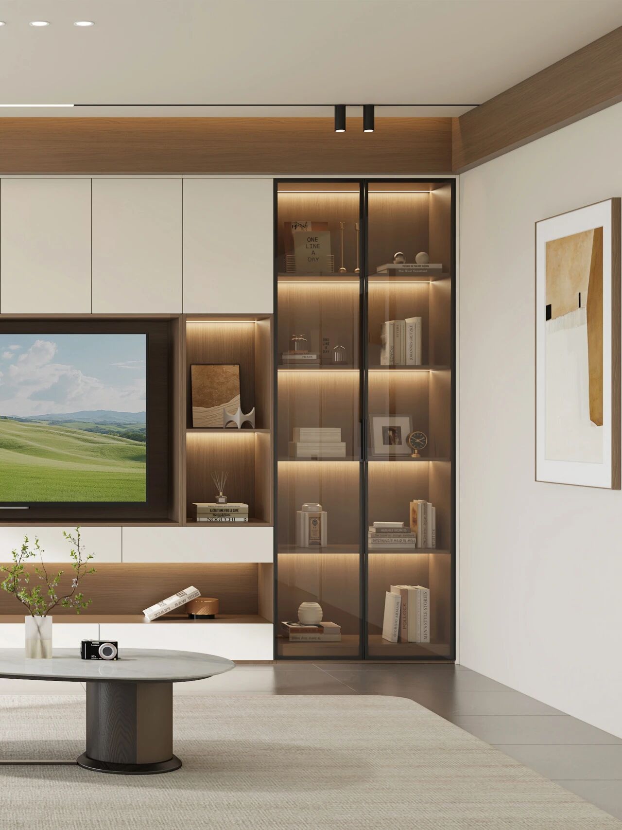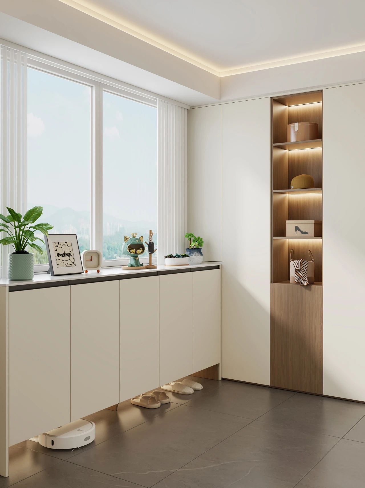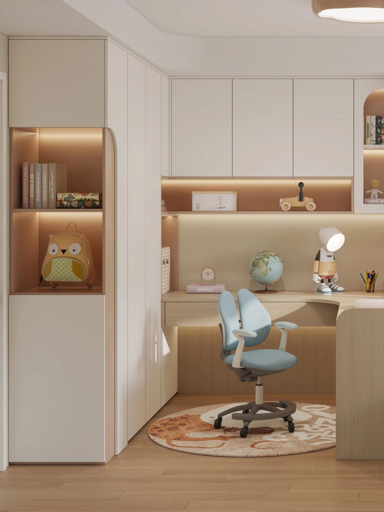 墻面擱板打造立體收納,燈帶靈動美觀??