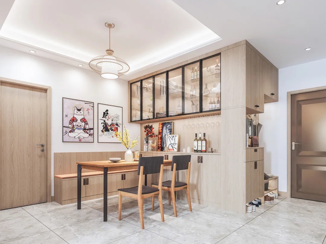 餐廳空間的面積有限,利用靠墻的位置打造了卡座,既增加了儲物空間,還能為用餐空間增添浪漫氛圍。幾何造型的吊燈、趣味十足的日式手繪插畫和定期更換的新鮮花束,無一不體現出屋主對精致生活的追求。