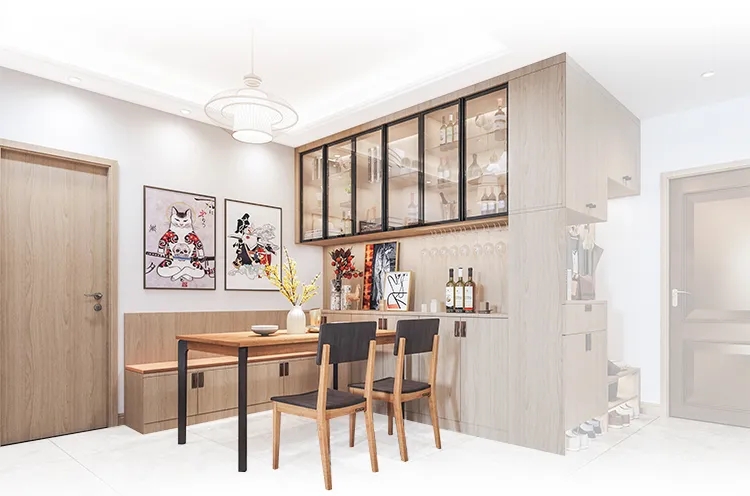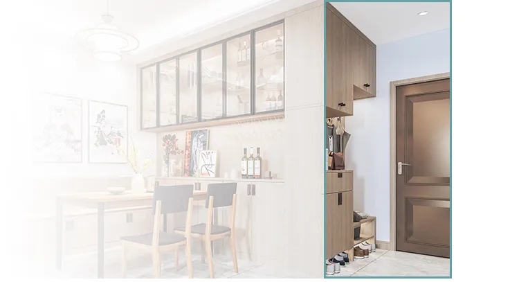 進門玄關景深不足,所以設計師充分利用墻面轉角空間,定制多功能玄關柜和顏值超高的半開放式餐邊柜,一方面滿足收納與展示的需求,一方面緩沖入戶空間的視線。風格統一的柜體,在視覺上顯得干凈整潔。