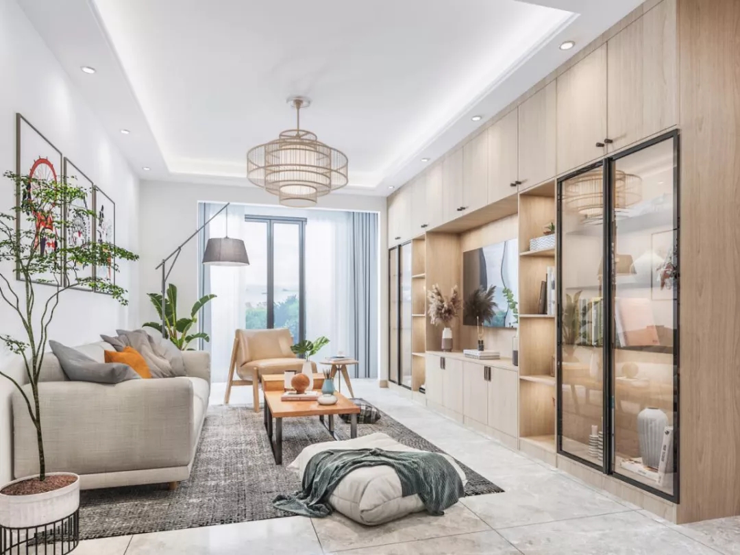 定制電視柜是客廳中的一道風景線。整體采用開放式置物格+玻璃柜的設計,除了能夠收納各種日用品,兩側的玻璃柜還能用于展示書籍和裝飾品,在視覺上起到延伸作用,使空間看起來更大。