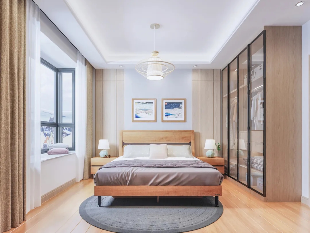 臥室沿用了簡約的原木風格,采用中心對稱式布局來平衡整個空間,增加視覺上的舒適度。天然生成的紋理、質樸自然的氣息,原木材質的床體、地板與柜體,又為空間增添了舒適寧靜之感。
