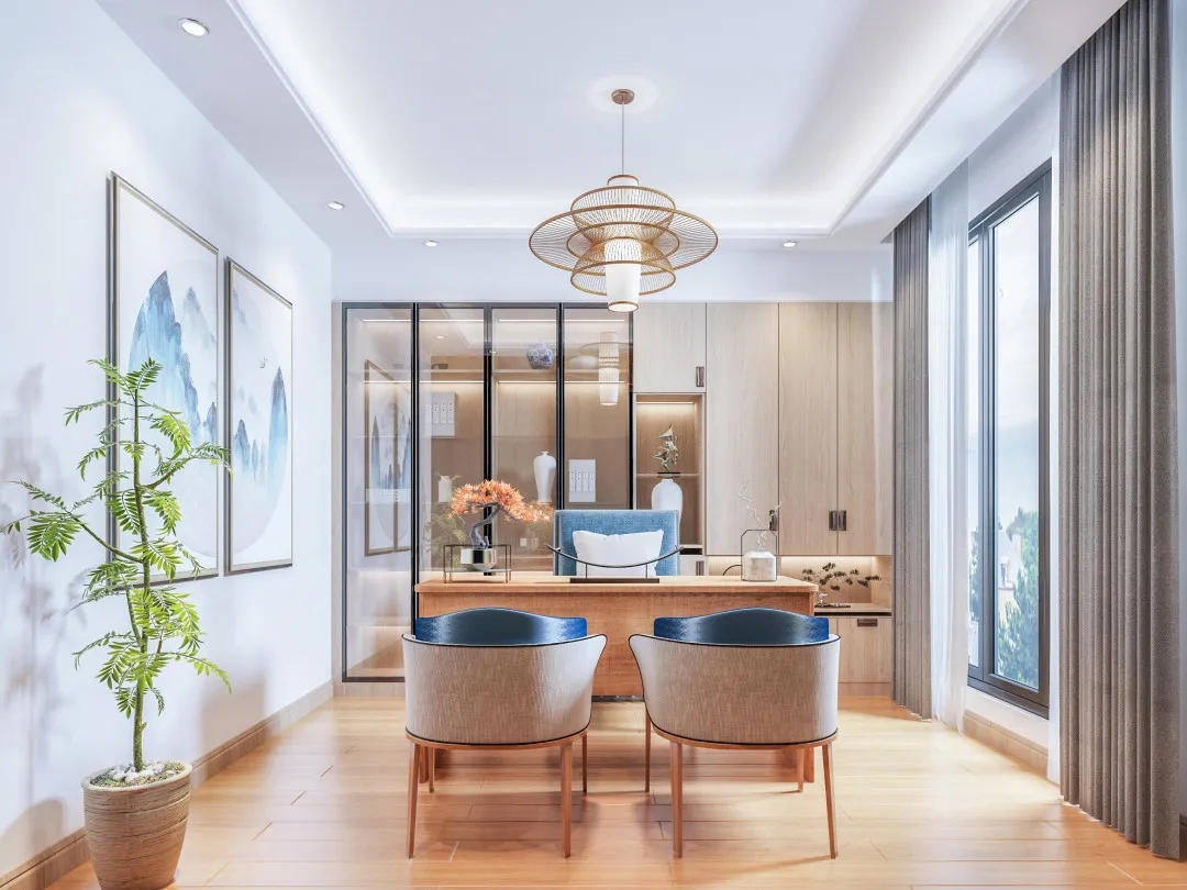 寫意的線條、雅致的色彩、柔和的布藝等諸多元素,再放置造型別致的中式盆栽和綠植擺件,空間瞬間豐富起來。只需放置兩把精致的會客椅,這間安靜、時髦的獨立書房也可以成為一間不錯的會客區。