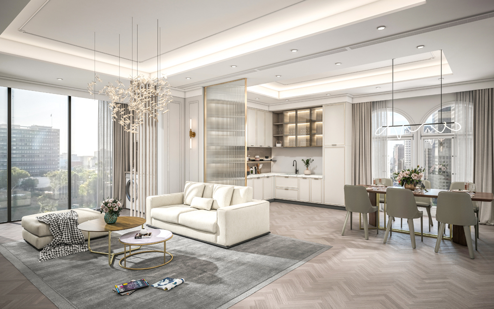 屋主想擁有開(kāi)放式廚房,所以設(shè)計(jì)師在這里砸掉了原本在客廳與廚房間的墻體(非承重墻),將其替換成了長(zhǎng)虹玻璃來(lái)進(jìn)行隔斷,在視覺(jué)上整個(gè)空間又因玻璃是半透明的質(zhì)感,讓人感覺(jué)“通而不空”,為空間增加了一分朦朧美。客餐廳與廚房三位一體,也讓整個(gè)房間看起來(lái)更大氣。