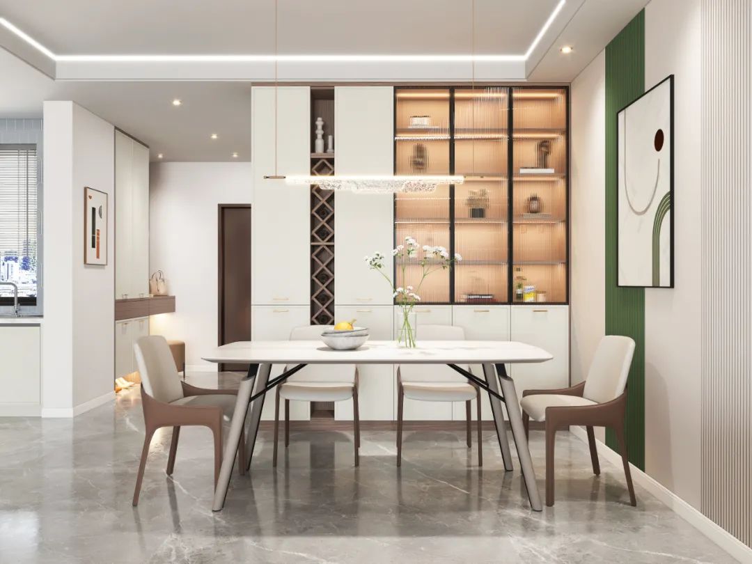 靠墻定制餐邊柜,儲物格+酒架設計,集儲物、藏酒、配餐于一體,滿足多樣化儲物需求,讓餐廳更井然有序。海浪灰玻璃柜門點綴應用,為餐廳帶來動靜相宜的朦朧美感,簡約的北歐風餐桌搭配精致鎏金吊燈,在舒適自然之外也更添浪漫氛圍。