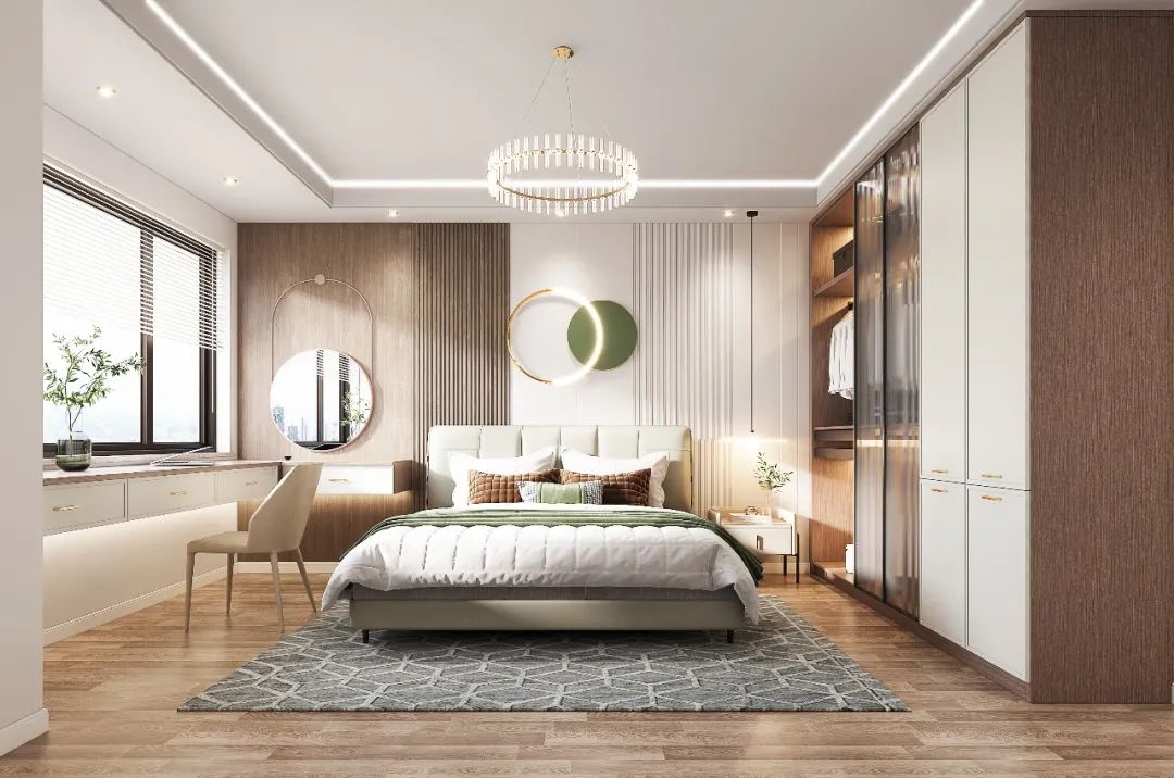 床頭背景選擇格柵護墻板,木質紋理與材質讓臥室更加溫馨,與玄關及客廳背景墻相呼應,帶來統一的立體感和層次感。靠墻定制整墻衣柜,閉合式和透明柜門交錯,搭配開放格設計,既保證了隱私性和美觀性,又讓衣物拿取更加方便。