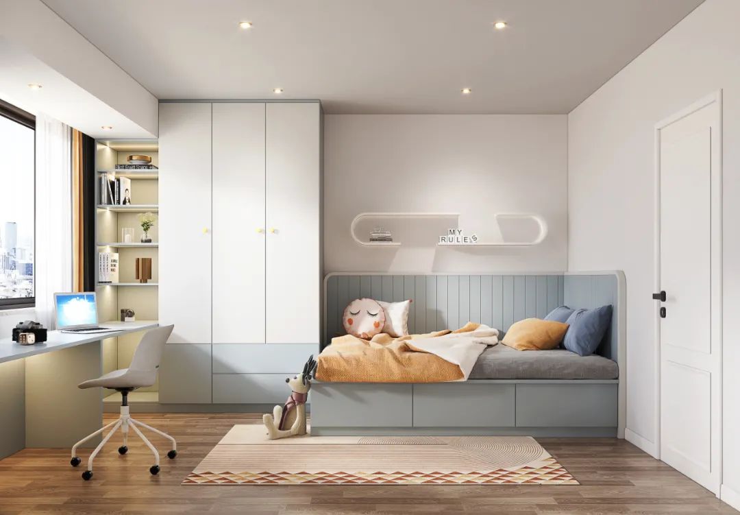 次臥選擇定制榻榻米代替普通的床,增加兒童房的儲物空間,側邊采用抽屜式設計,物品拿取更方便。衣柜+開放格組合設計,衣物玩具皆有去處。為了滿足周先生孩子的學習需求,設計師還在開放格齊腰處延展出定制臺面作為書桌,這里靠窗采光優越,孩子學習疲憊時還可以遠眺,放松身心。