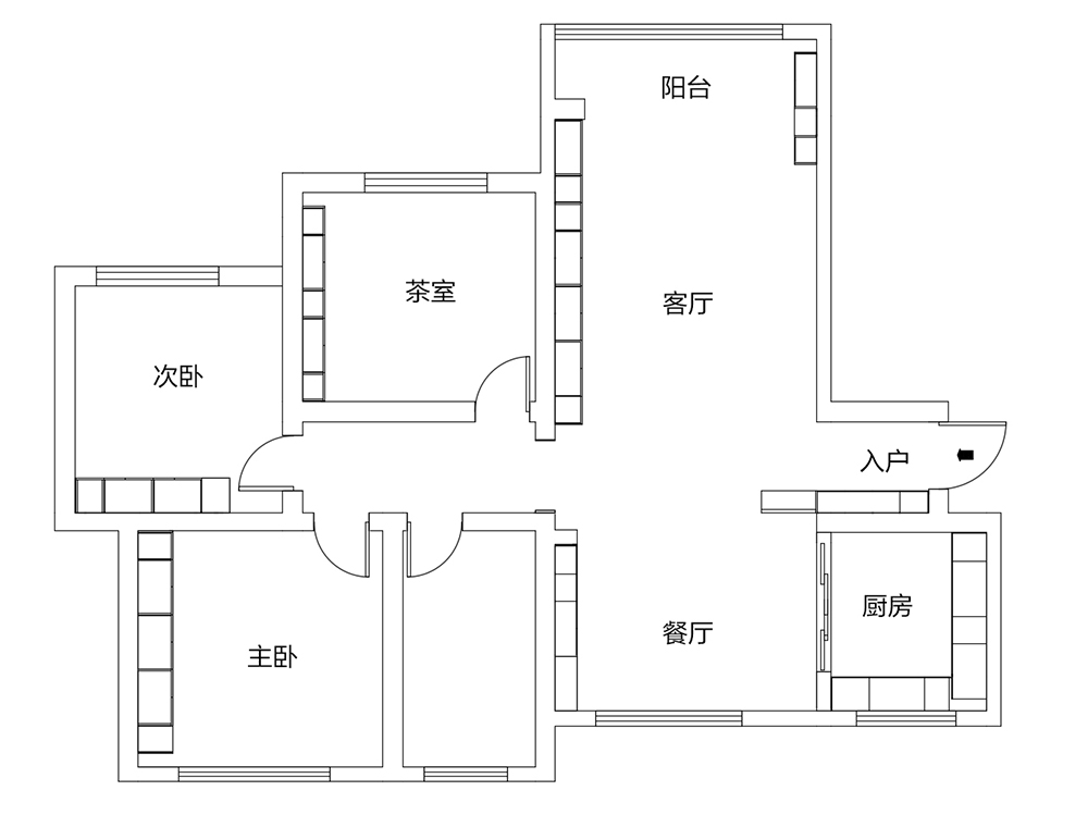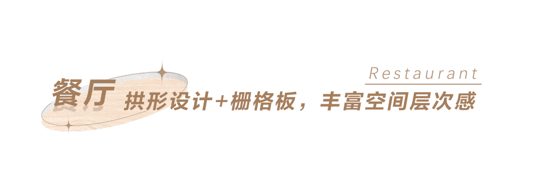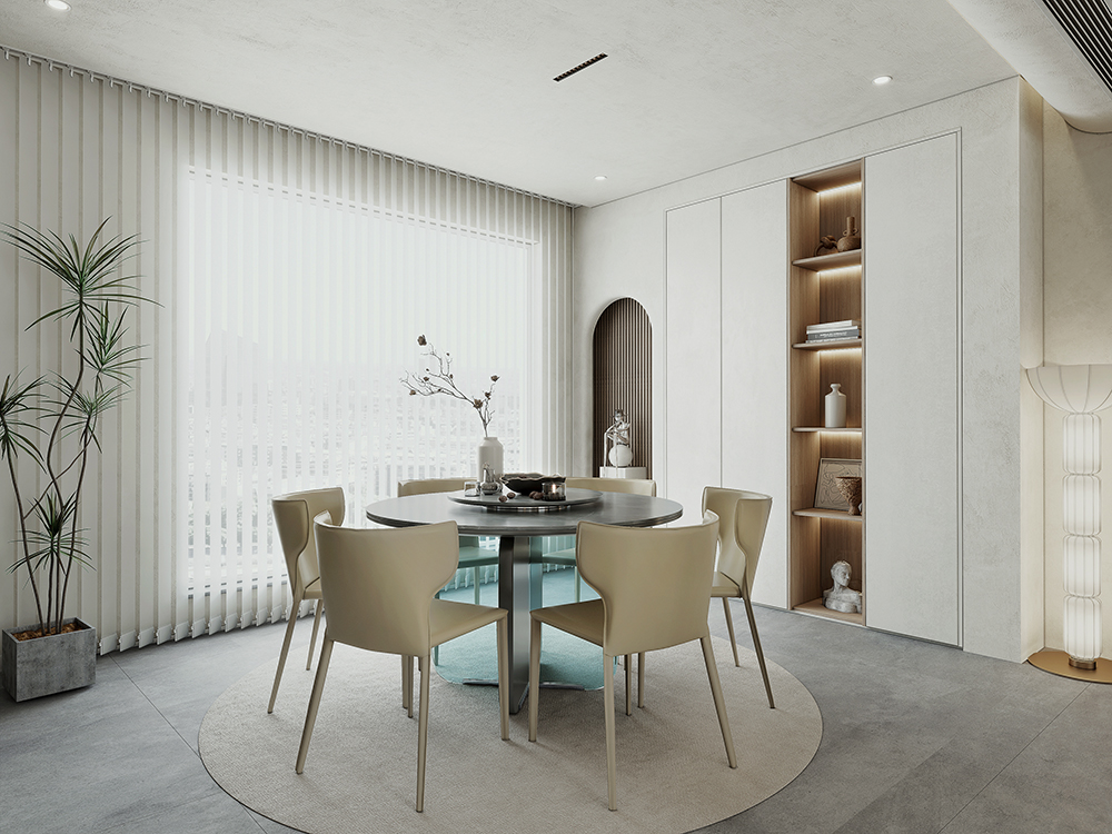 餐廳內嵌餐邊柜,水杯、衛生紙等雜物或小電器被柜體隱藏,餐桌更干凈整潔。拱形門洞搭配柵格設計,形成秩序感的層次劃分,擺件更為空間增添了藝術格調。