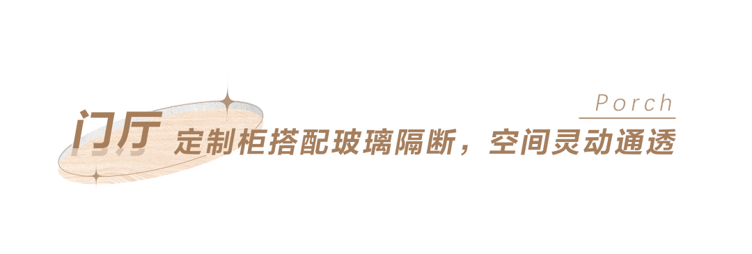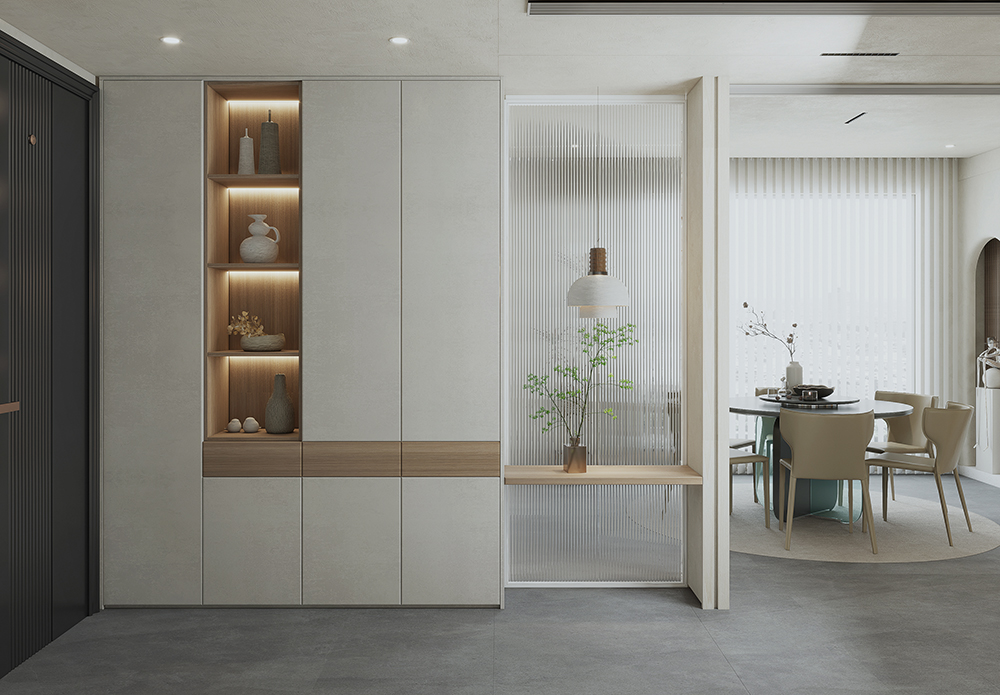 進門處定制半開放式玄關柜,開放格內置燈帶,點亮歸家的第一抹暖光。長虹玻璃既保護了隱私,又帶來了若隱若現的視覺美感,擺放綠植,賦予了入戶空間自然的靜默感。