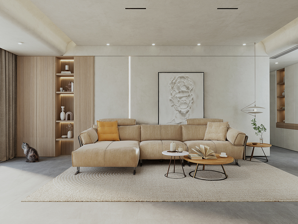 為了讓空間不顯單調,設計師為沈女士推薦了“凡爾賽”沙發,溫柔的奶油白搭配蜜瓜橙,低調而不失高級,木質茶幾和邊幾以自身的天然特質,延續了整體空間的樸實與隨性感。