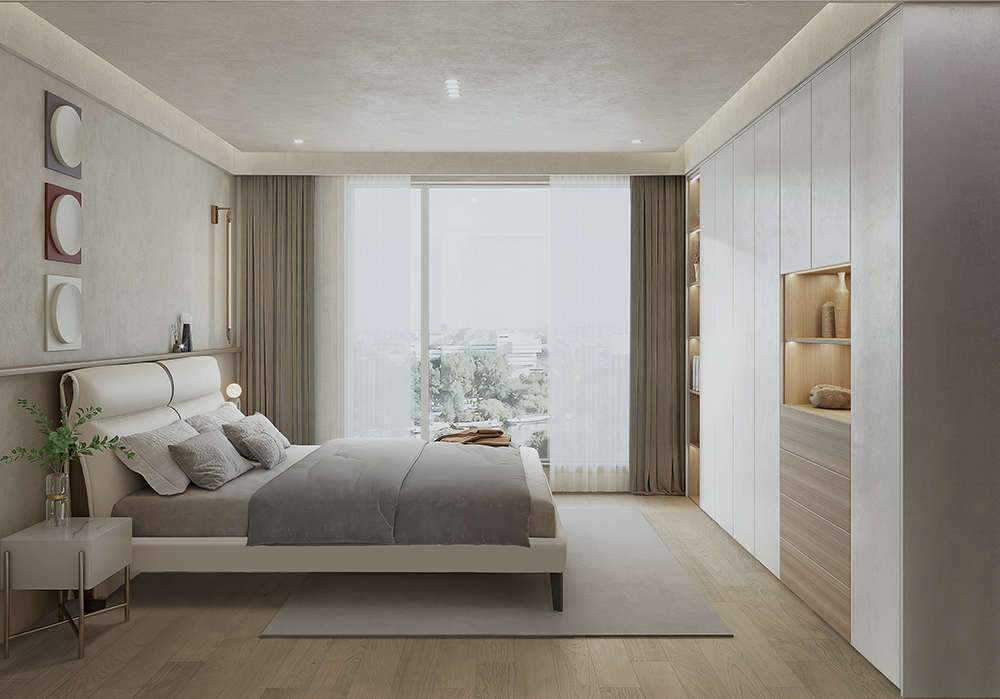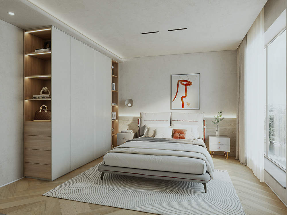 定制到頂式衣柜,增大收納空間,超高門板+無拉手設計,盡顯極簡之美,統一整潔的立面讓日常清潔也更方便。背景墻用半截木飾面做裝飾,內置隱藏式燈帶,打造出柔和靜寂的光線效果,烘托出舒緩靜謐的睡眠氛圍。