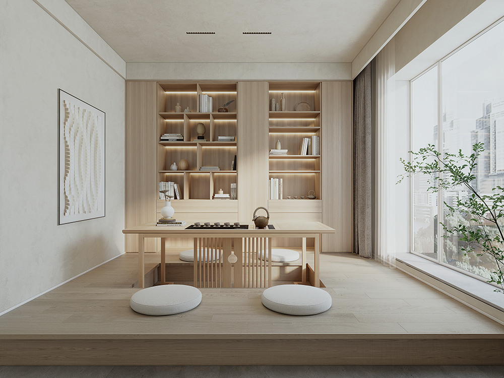 書房定制地臺,不規則的整墻書柜可以收納沈女士丈夫的書籍,同時帶來不對稱的包容美感,天然的木質紋理質樸而隨性。智能茶桌搭配蒲團,書房又能當茶室使用,閑暇時約上三五好友,便可在此閑談品茗,完成空間的靈活轉換。