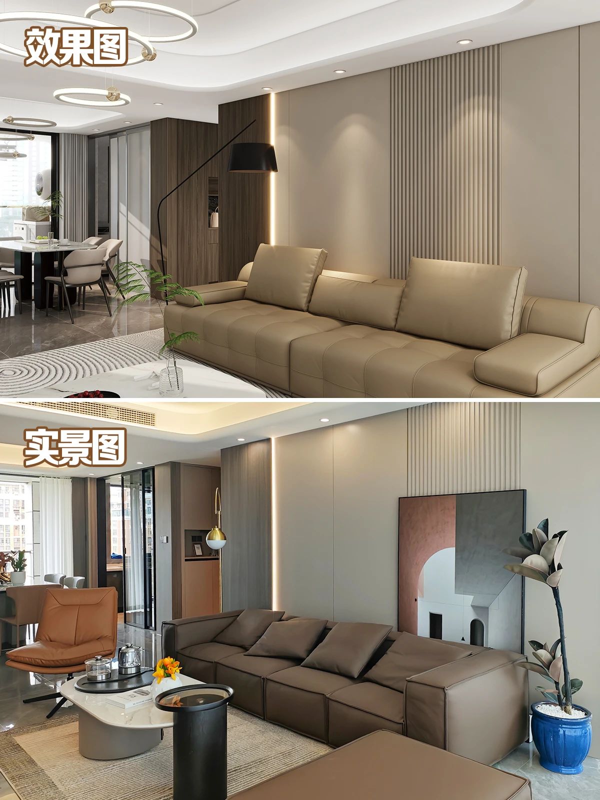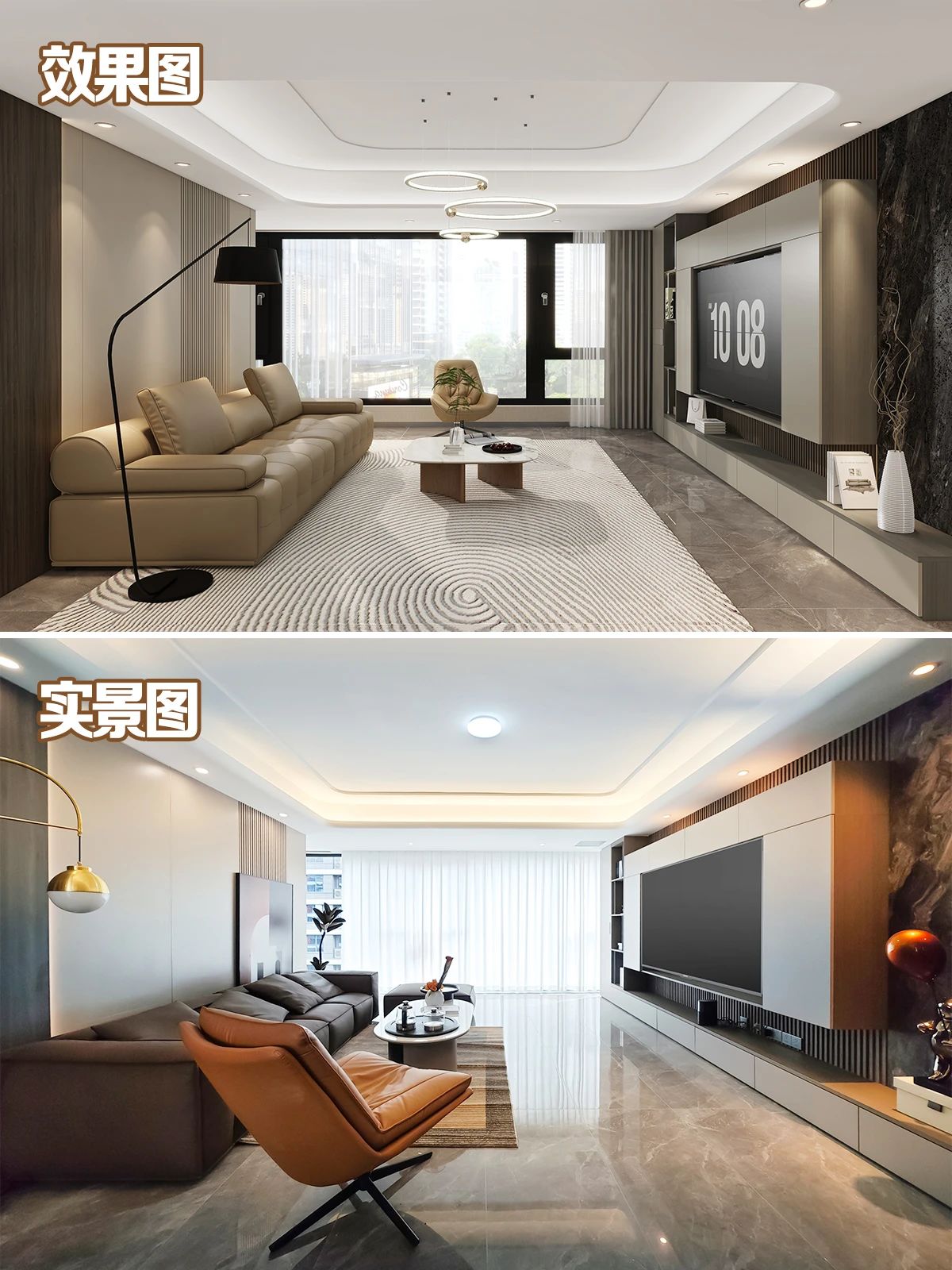 ②護墻板+木飾面裝飾沙發背景墻???內嵌燈帶提升空間氛圍,高級格調直接溢出屏幕??