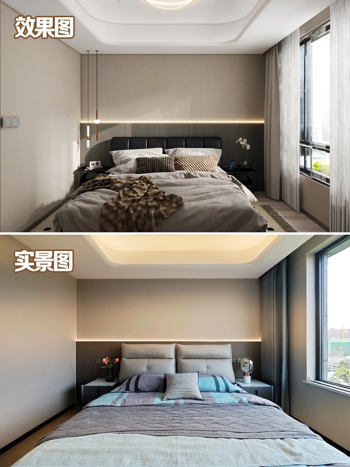 次臥床頭安裝半墻護墻板,深色木紋溫馨自然,內置燈帶靈動輕盈,起夜不摸黑??
