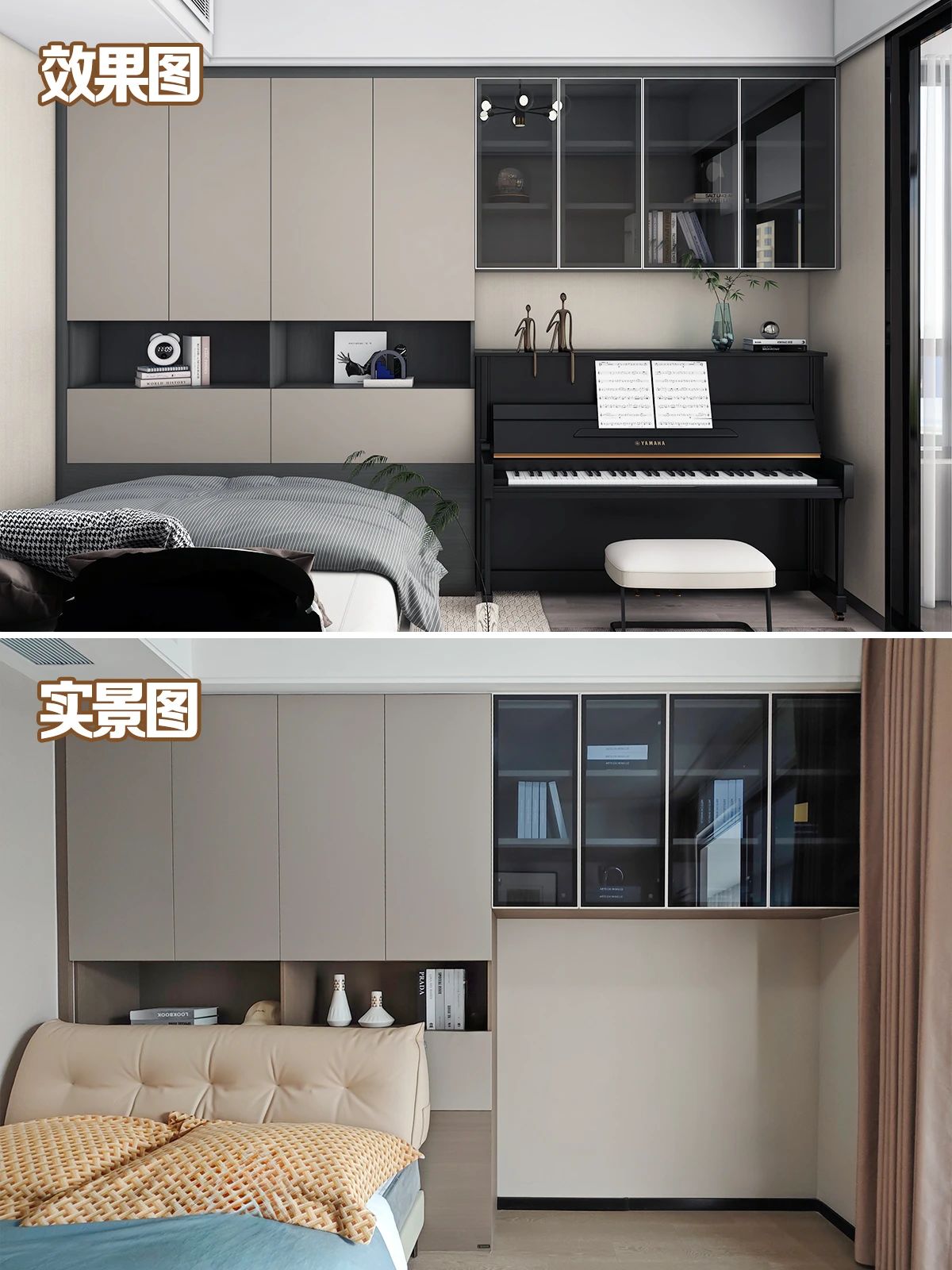 衣柜+書柜一體??提升空間利用率,無床頭設計節約空間,可根據需求添加靠包,方便留宿,還能當孩子的鋼琴房喔~??