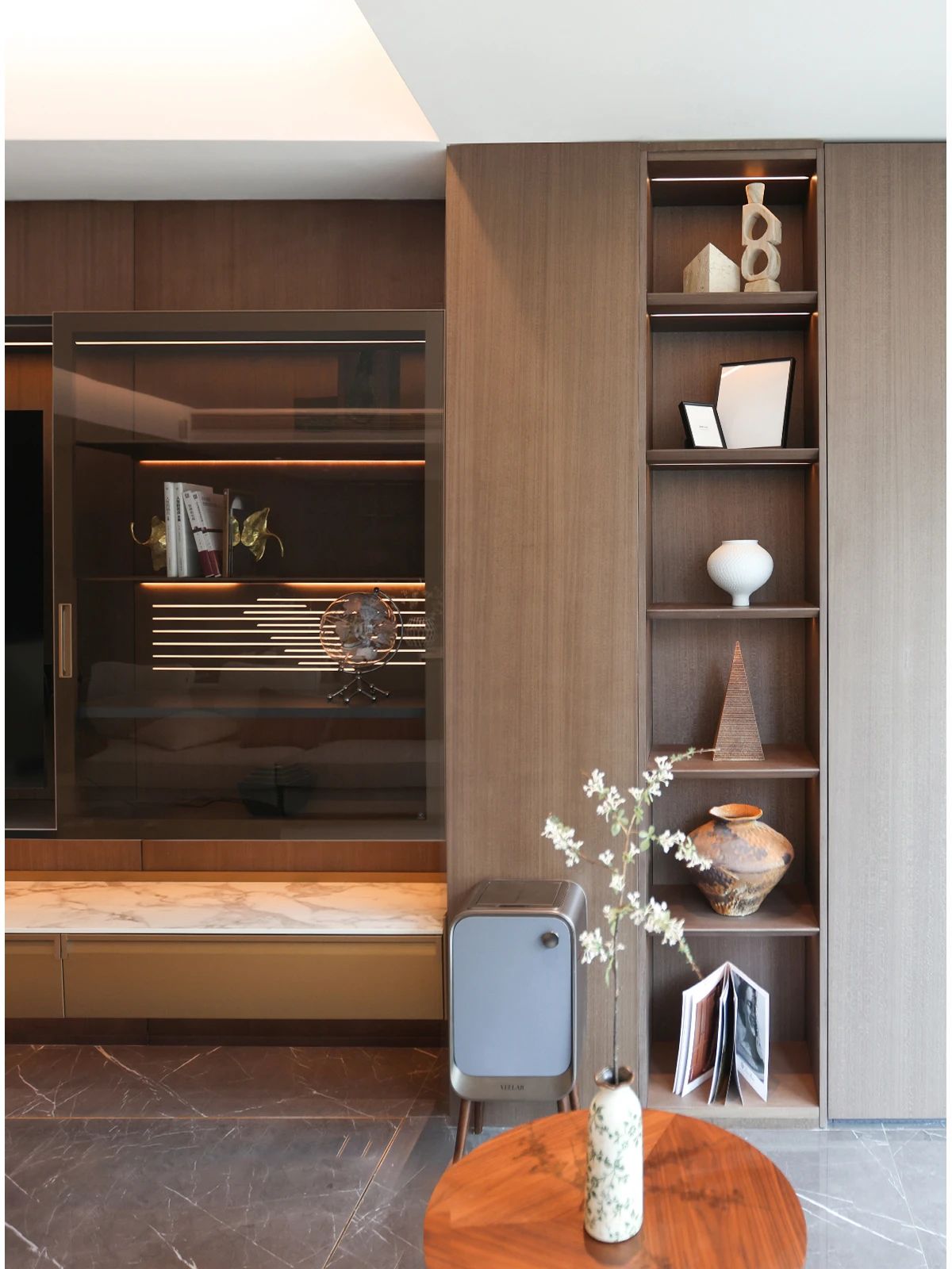 ②溫潤木紋搭配玻璃門,沉穩而不沉悶;玻璃柜內設展示區,美觀不藏灰?