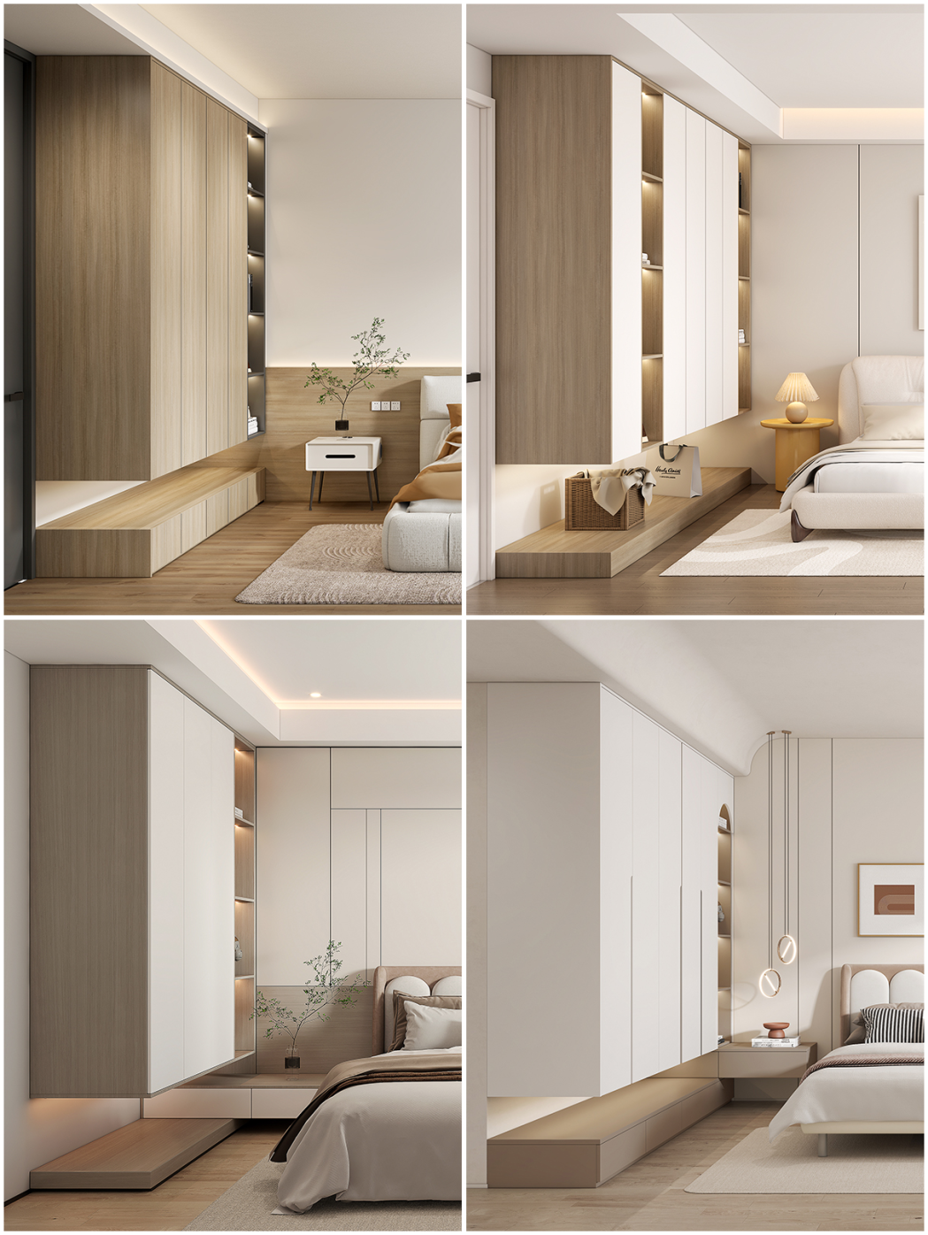 衣柜采用懸浮設(shè)計(jì),離地輕盈通透,穿插床頭柜,設(shè)計(jì)感十足?