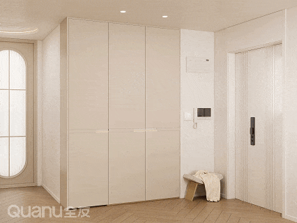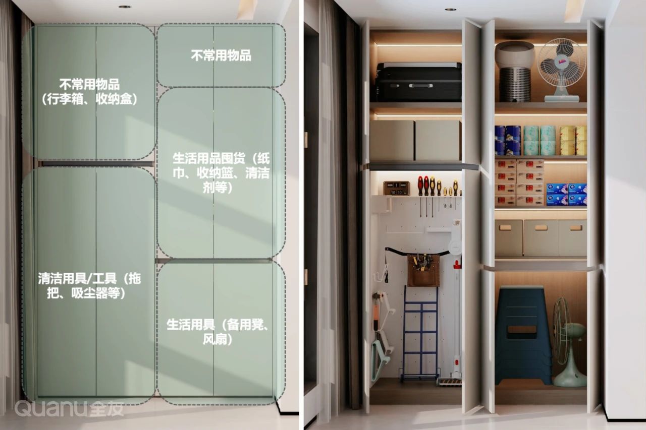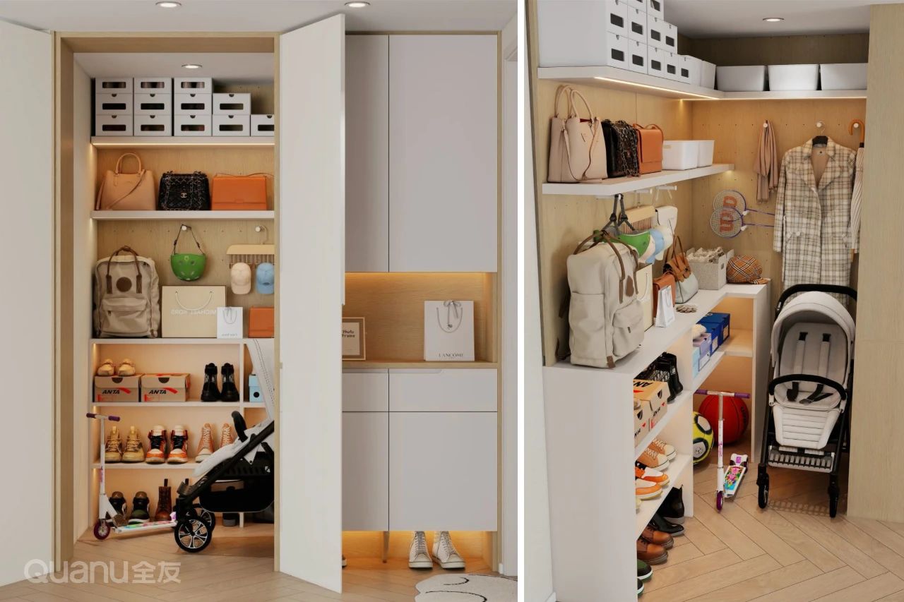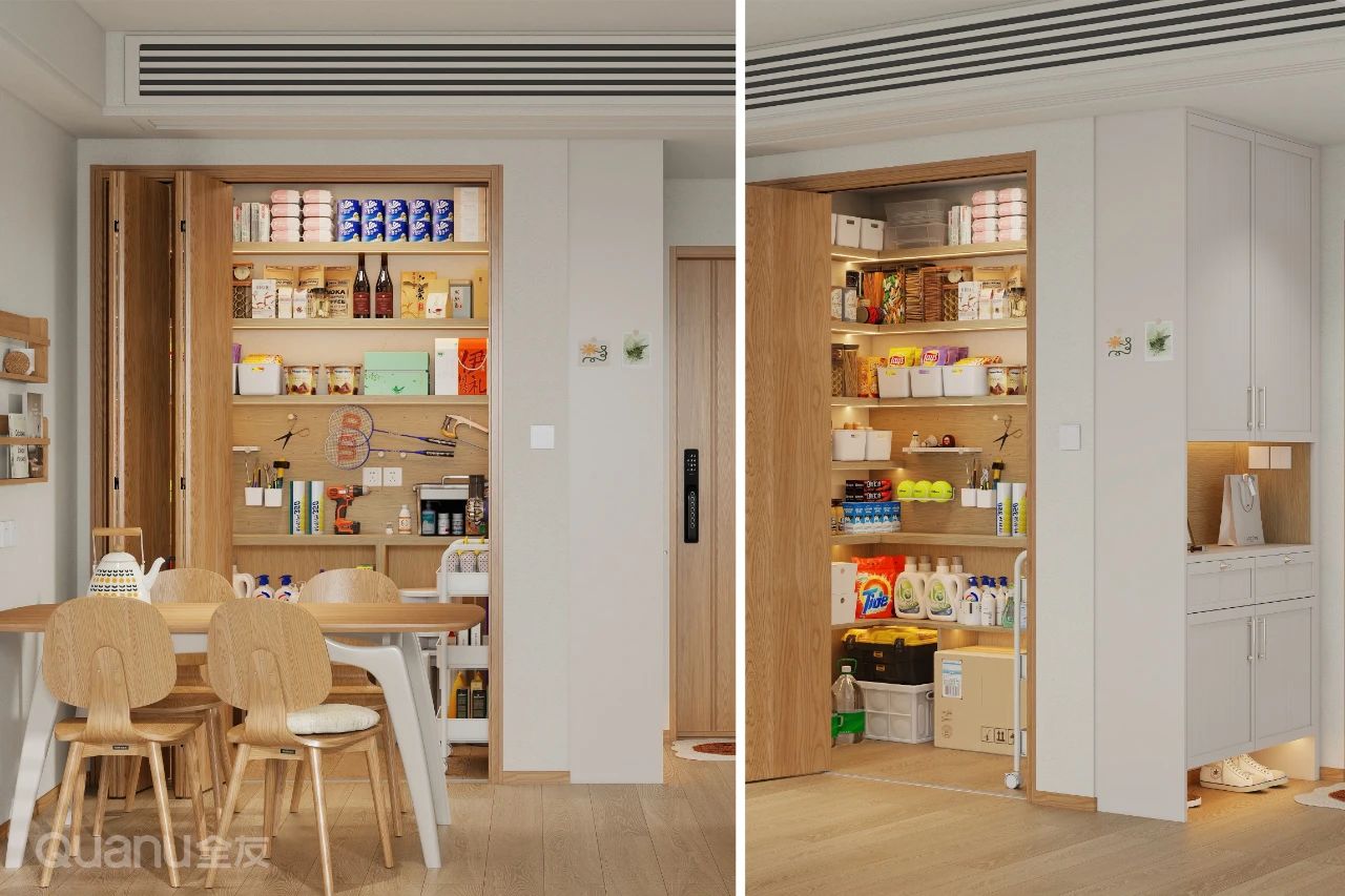 方案①:廚房讓出1㎡,在入戶鞋柜雙開門內設計800庫,開門收納生活雜物,關門即可瞬間隱形