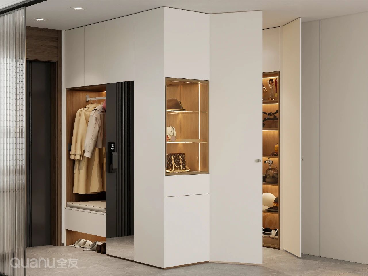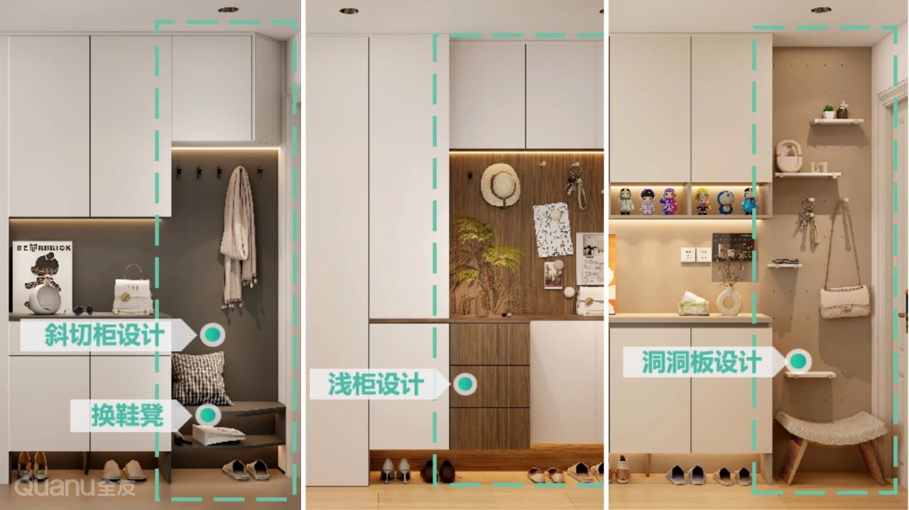 方案②:若入戶開門區域較窄,可在定制鞋柜中結合斜切柜、淺柜或洞洞板設計,既方便隨手置物,又能避免傳統直角柜體妨礙開門或日常通行