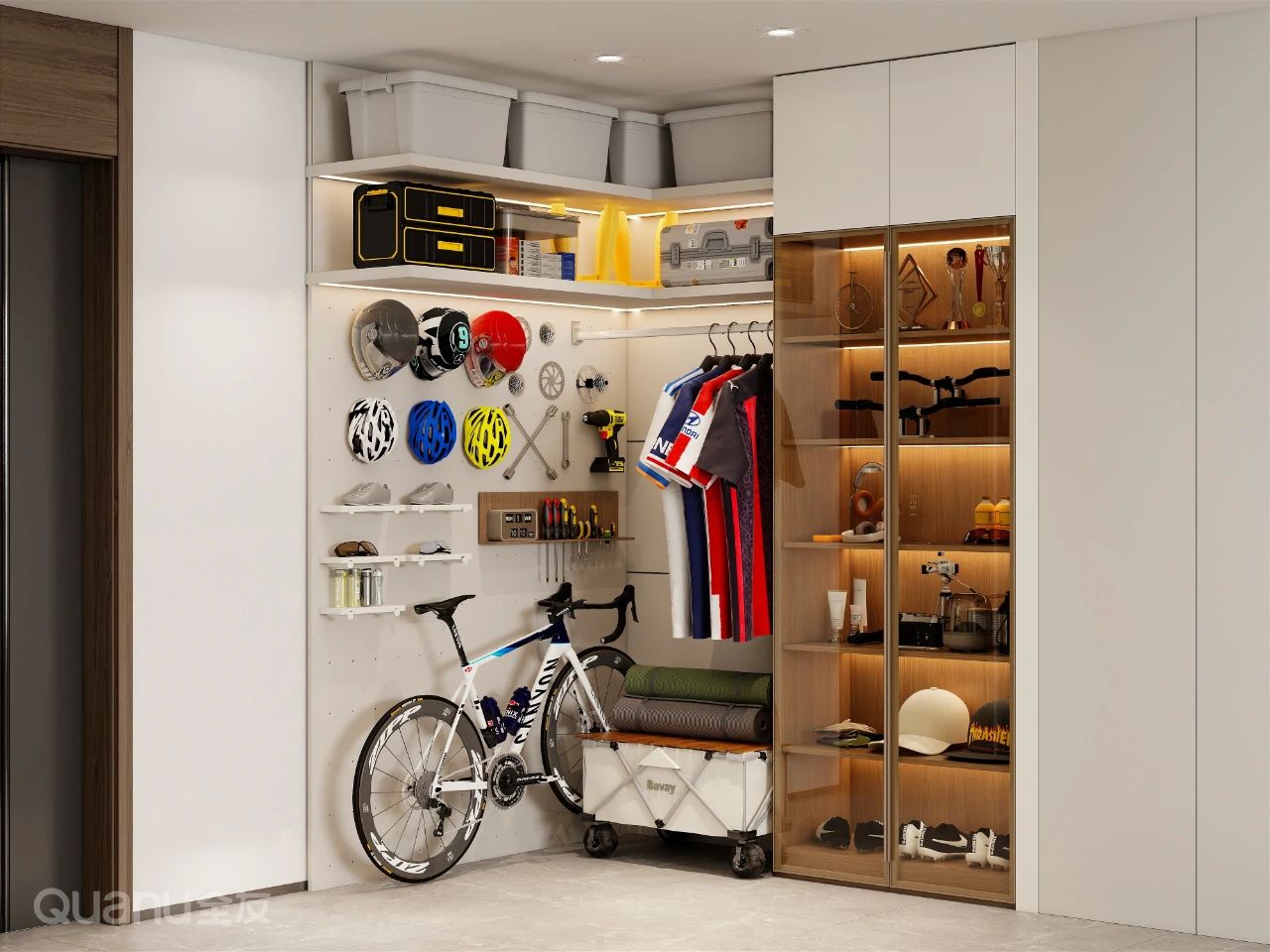 方案③:入戶花園封起來,外側定制儲鞋區、掛衣區等,滿足玄關收納需求;內部采用活動層板和洞洞板分區收納,空間利用率拉滿,既是儲物間,也是業主愛好的小型展覽館