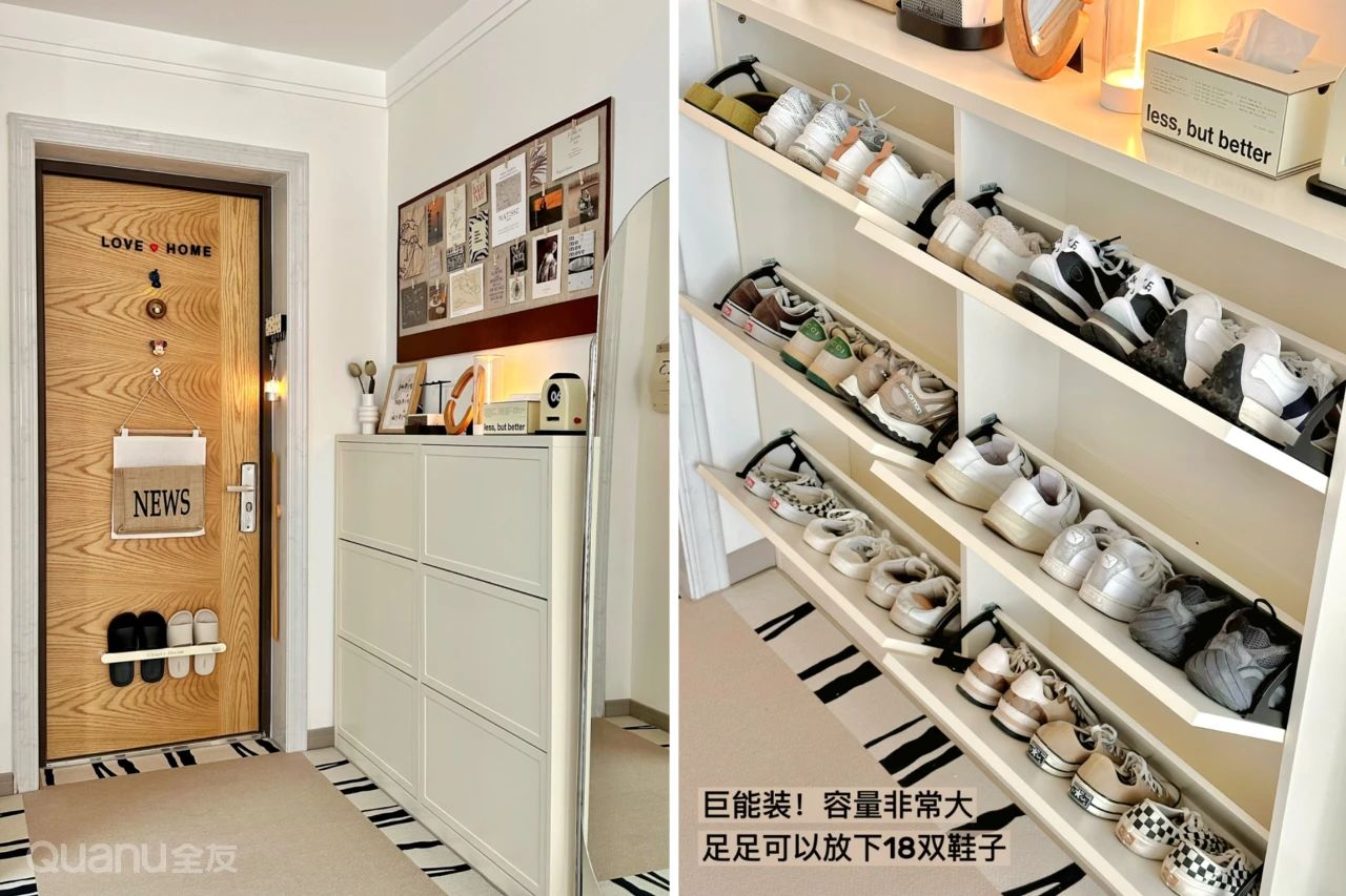 方案①:若入戶整體尺寸較窄,可定制或選購超薄鞋柜,采用翻斗柜門設計,比常規鞋柜更省空間
