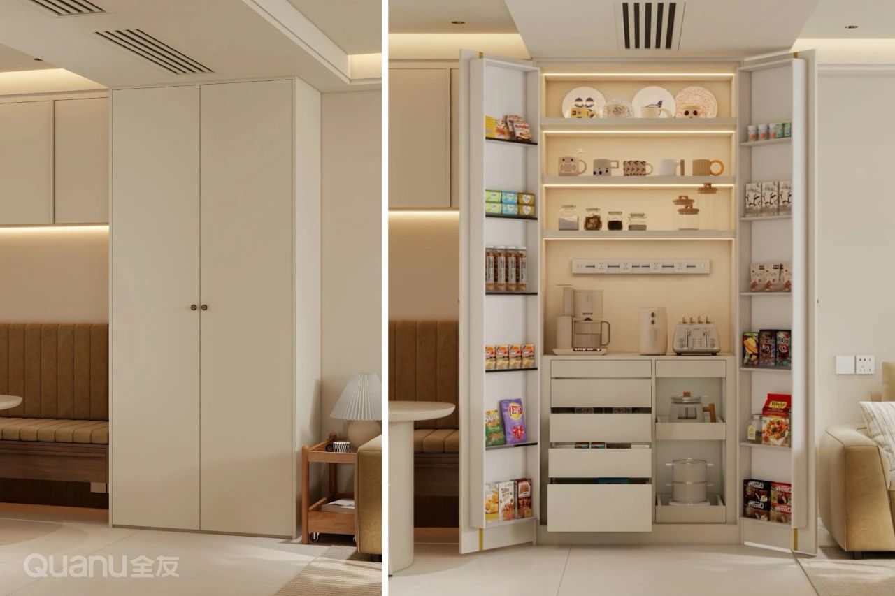 雙開柜門內側安裝擋板劃分零食、飲品收納區;柜內采用分段式設計+多層抽屜,中部操作臺放置咖啡機等小家電,儲物能力超傳統餐邊柜3倍。
