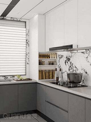 貼合煙道定制淺柜,調料干貨統統上墻,既能美化廚房空間,還能將瓶瓶罐罐集中收納,避免臺面雜亂,防止油污沾染。