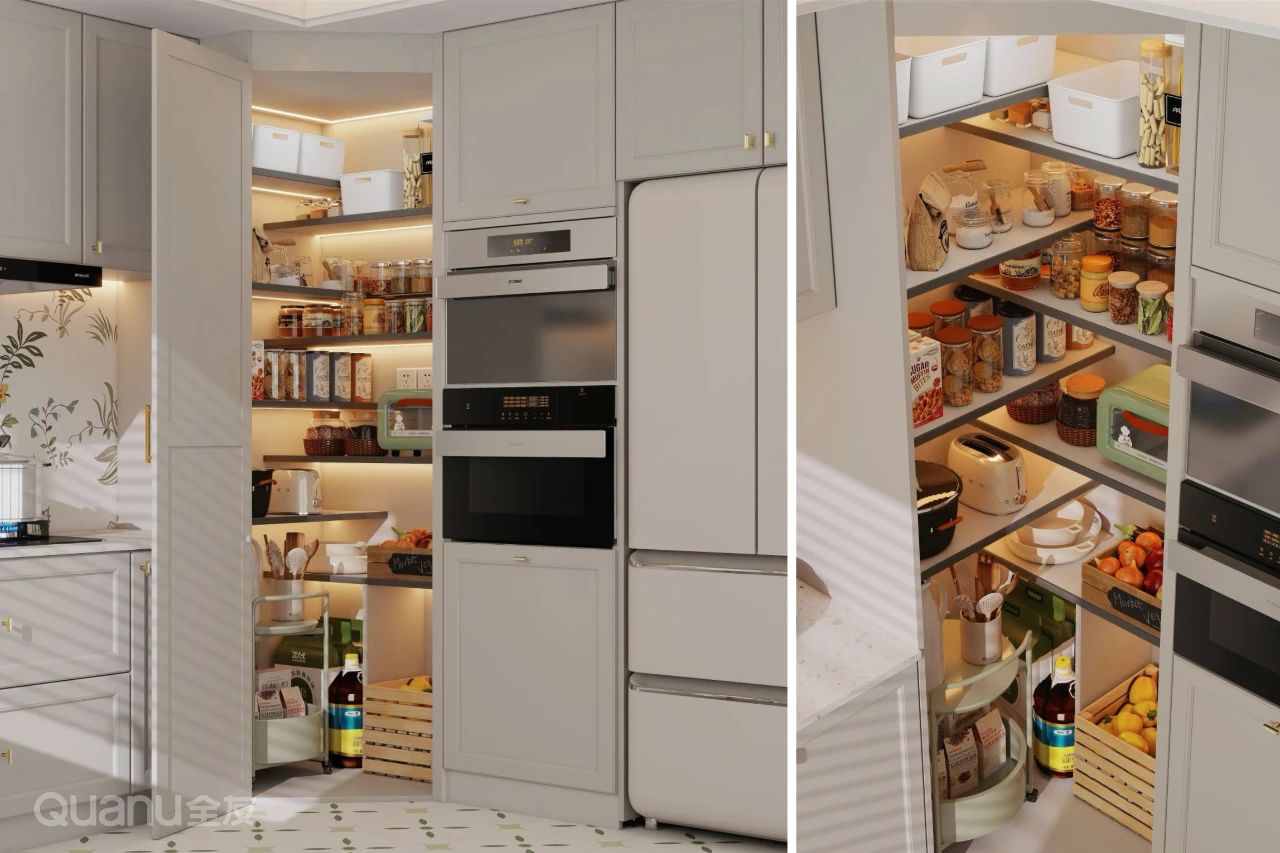 在廚房轉角定制鉆石型高柜,內置錯層層板。下層存放米面糧油和小推車,中部黃金位收納調味醬料和小型家電,頂部儲存干貨雜物。不到1㎡,就能容下半個廚房的囤貨!