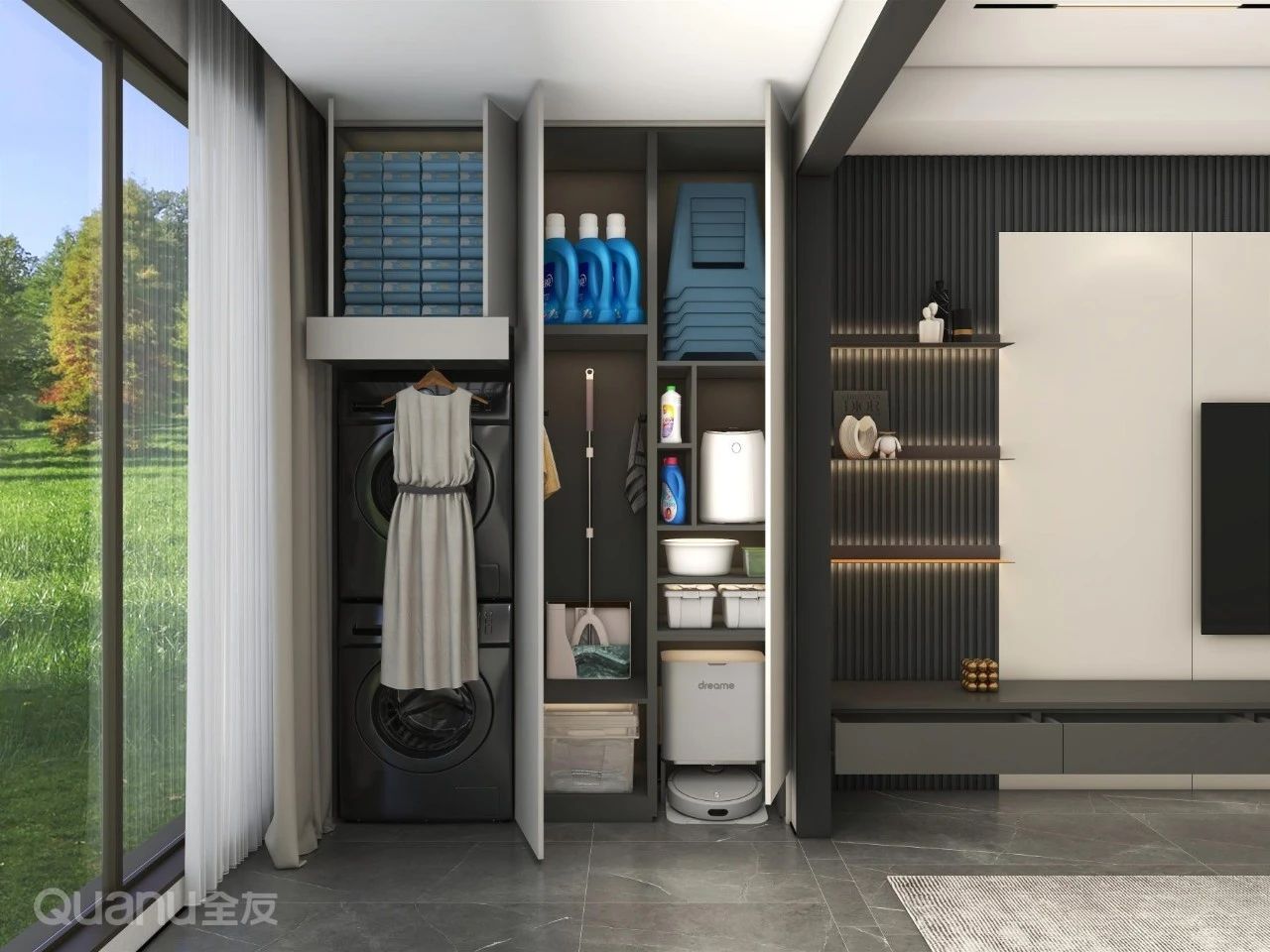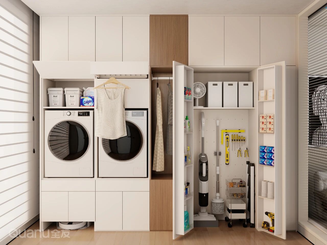 陽臺改為家政區,洗烘套裝內嵌,定制家政洗衣柜。不僅占用面積小,還能同時滿足衣物的清潔晾曬和工具收納等需求,讓家務處理更加高效集中。
