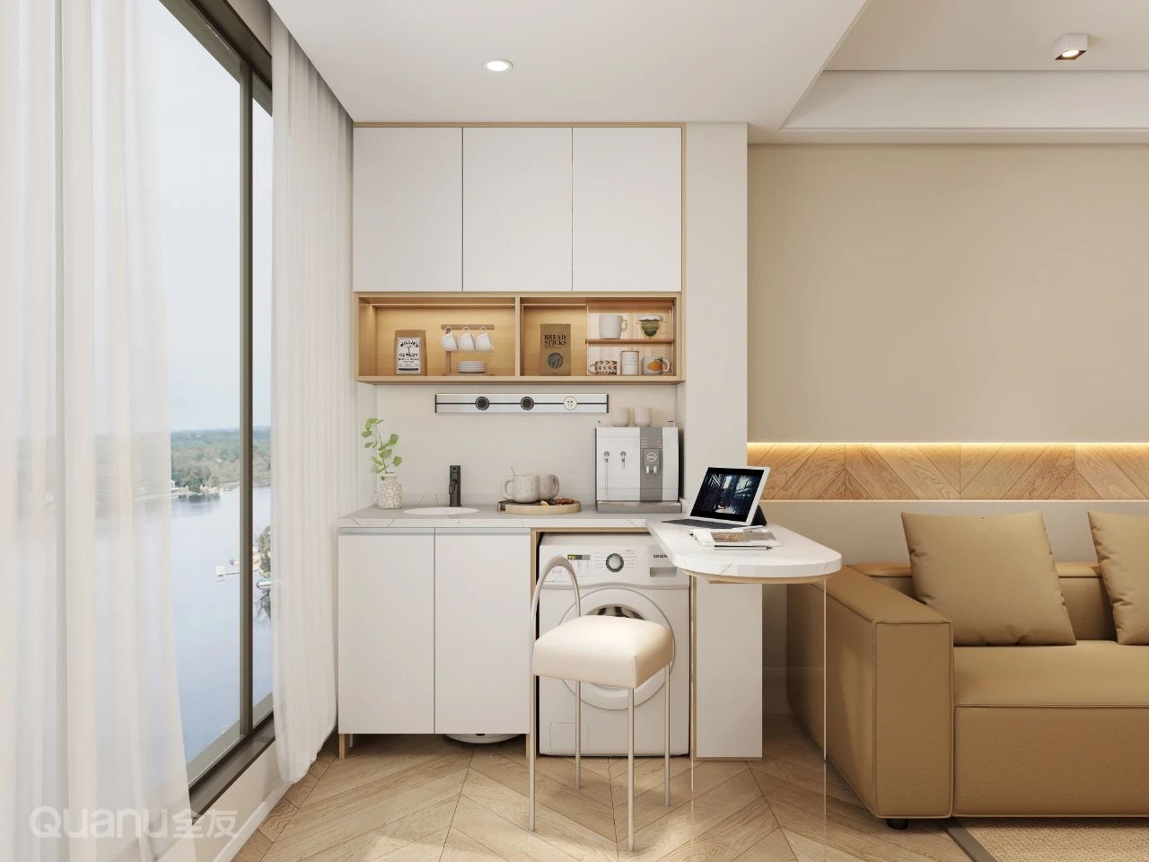 方案①:桌柜一體,在陽臺與客廳結合處打造轉角吧臺,解鎖儲物+辦公雙重功能;中部還可增設操作區,構造水吧臺,輕松營造精致小資氛圍。