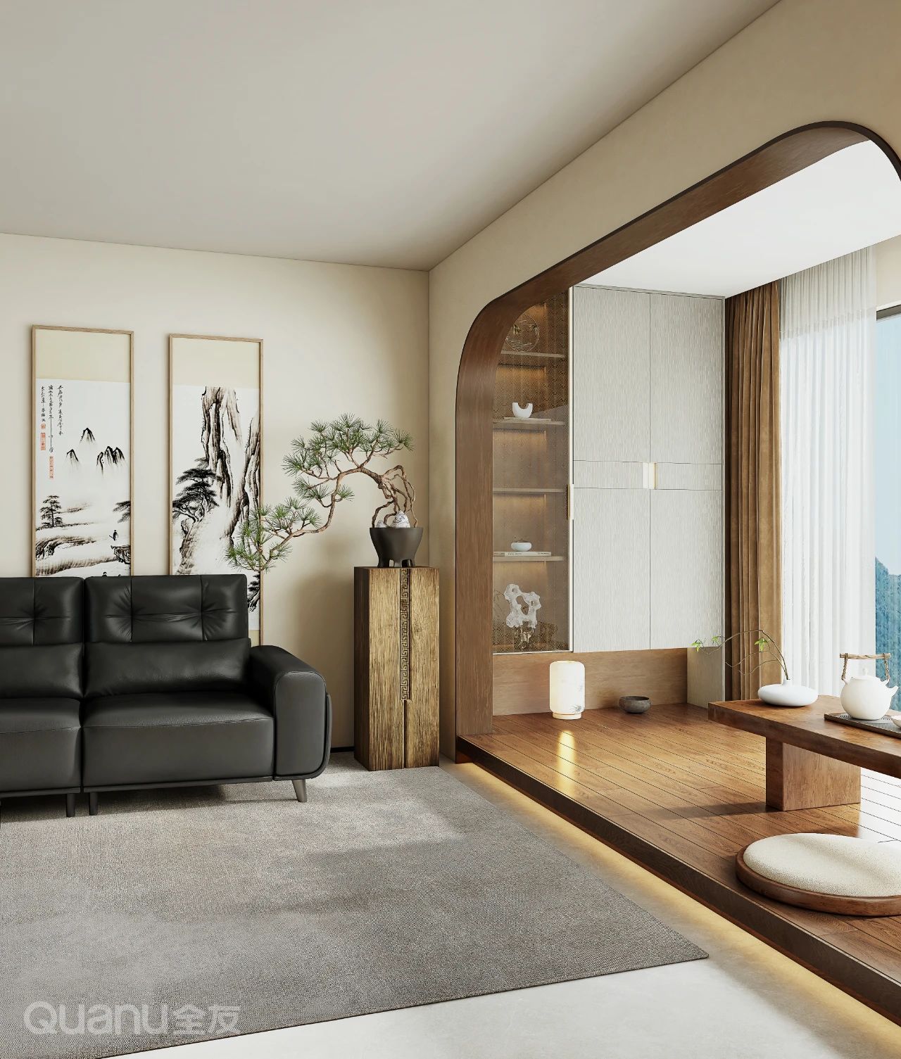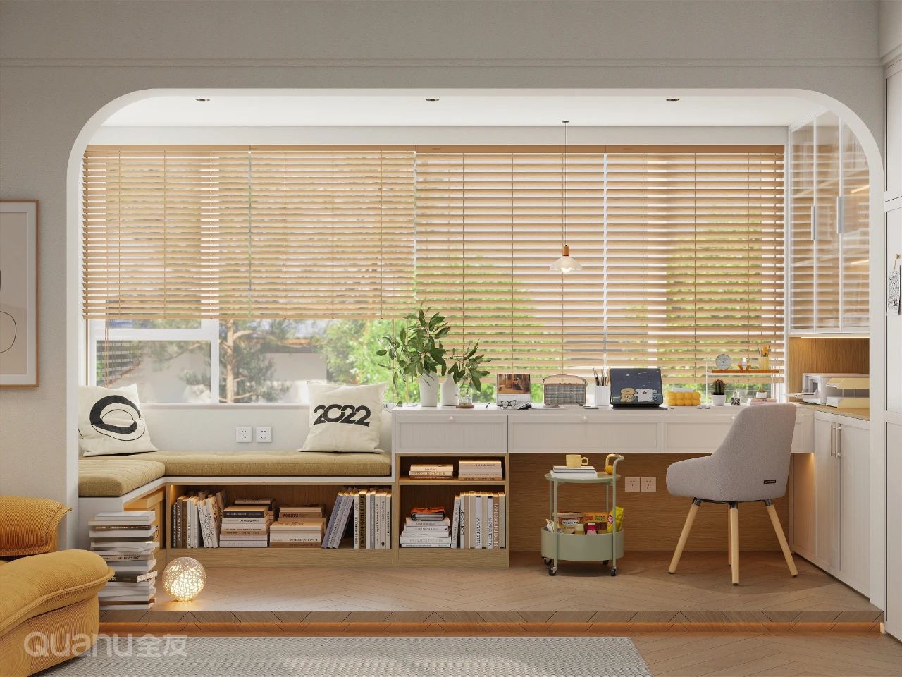 方案②:陽臺抬高10cm定制地臺,兩側墻面巧設陽臺柜,沿窗打造書桌卡座,既能滿足學習、辦公需求,又能兼顧收納功能;也可放置茶臺和蒲團打造休閑區,看書、品茗,盡享愜意時光。