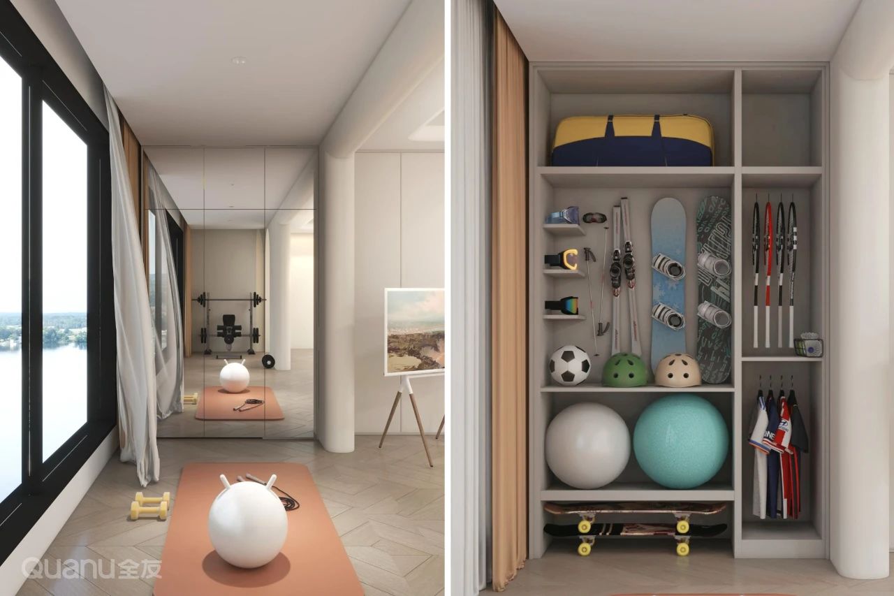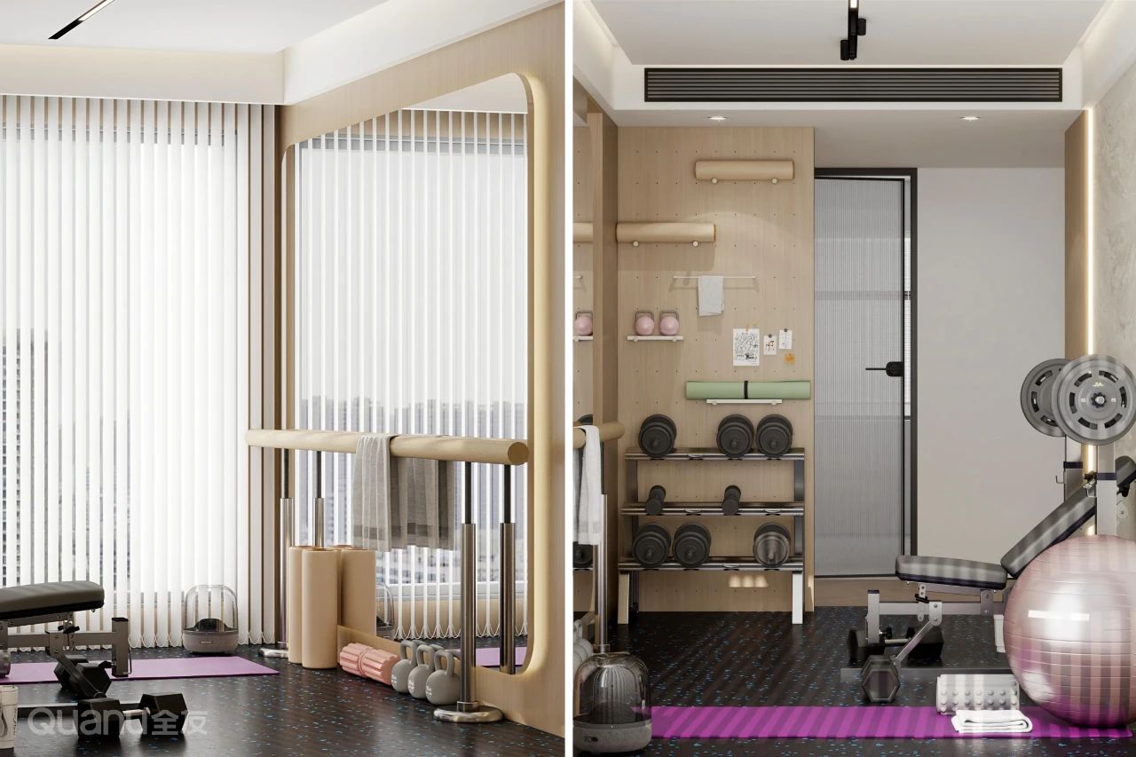 定制通頂收納柜,或在墻面安裝洞洞板、掛鉤收納小型器材,釋放地面空間。搭配全身鏡使用,既能輔助動作矯正,又能在視覺上擴大空間感。