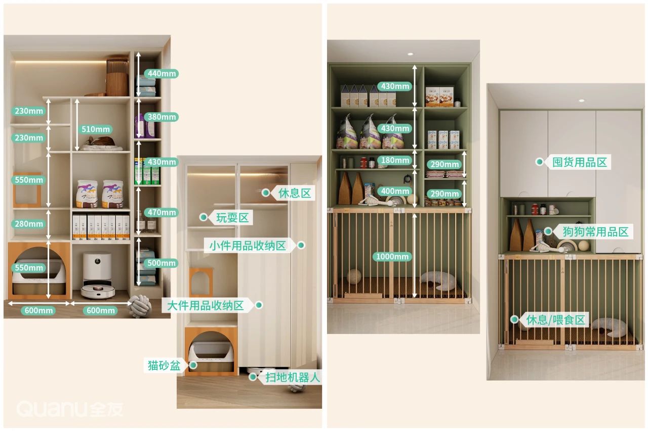 柜內劃分為休息區、飲食區、活動區和收納區等功能板塊;針對家有貓咪的業主,還可內置貓爬架供其攀爬嬉戲,外用玻璃柜門,一眼明了貓咪動態。