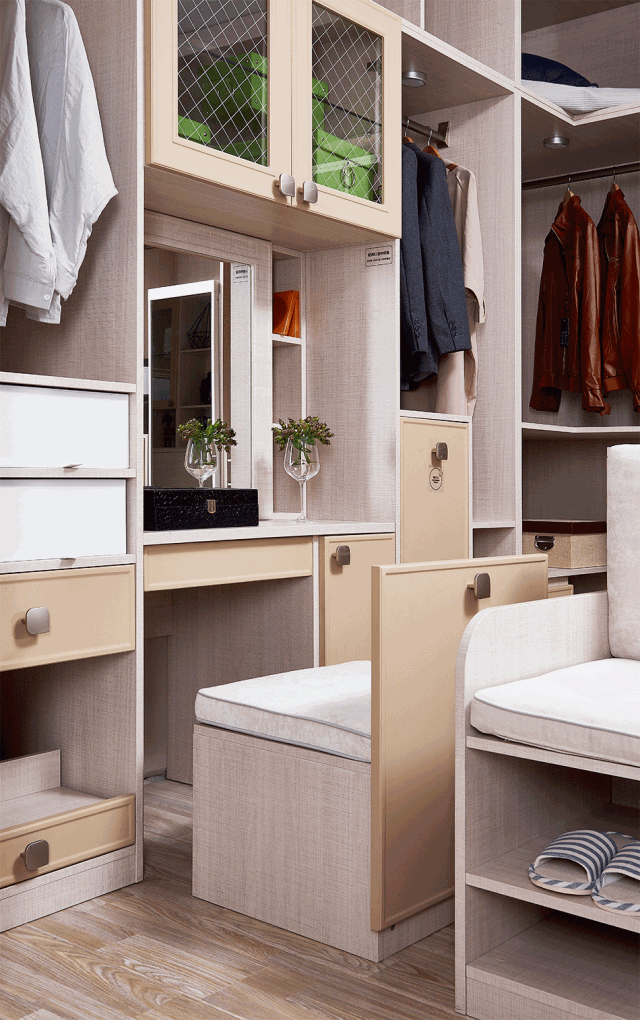 擁有極強(qiáng)收納功能的衣帽間空間還隱藏了貼心的一體式座椅設(shè)計(jì),