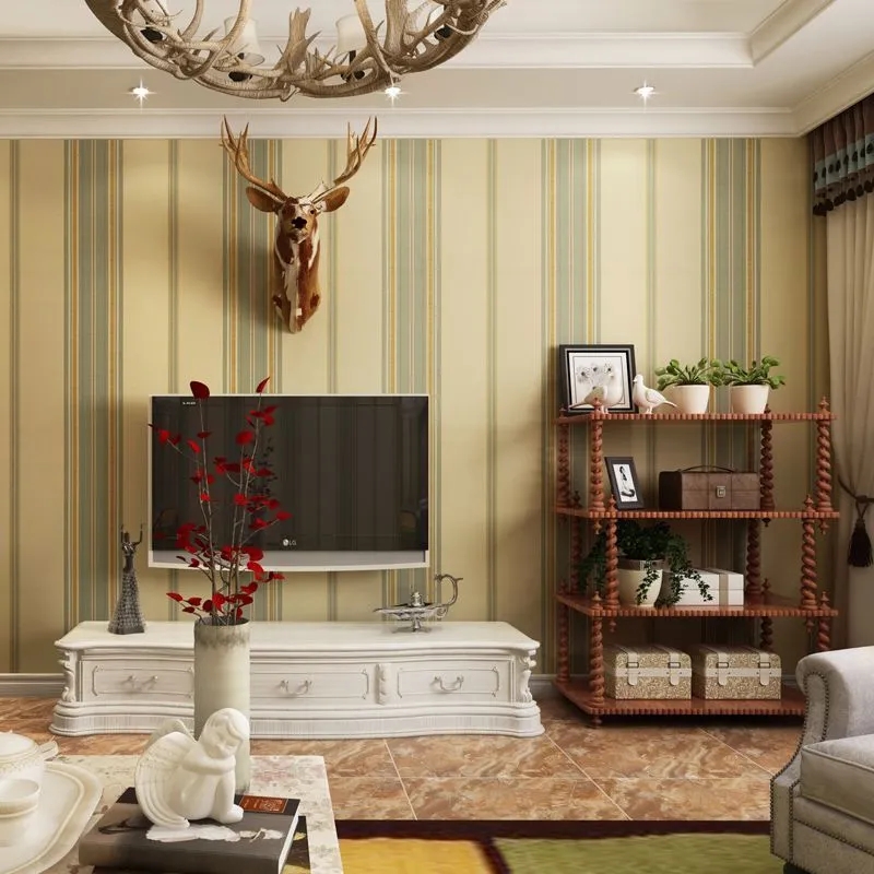 如果選擇采用墻紙或墻布裝飾,可用橫豎線條來延伸空間,例如:層高較矮,可用豎紋墻紙增加空間高度感;房間較窄則用橫紋墻紙延伸房間縱深感,這一規律也適用于裝飾地板。