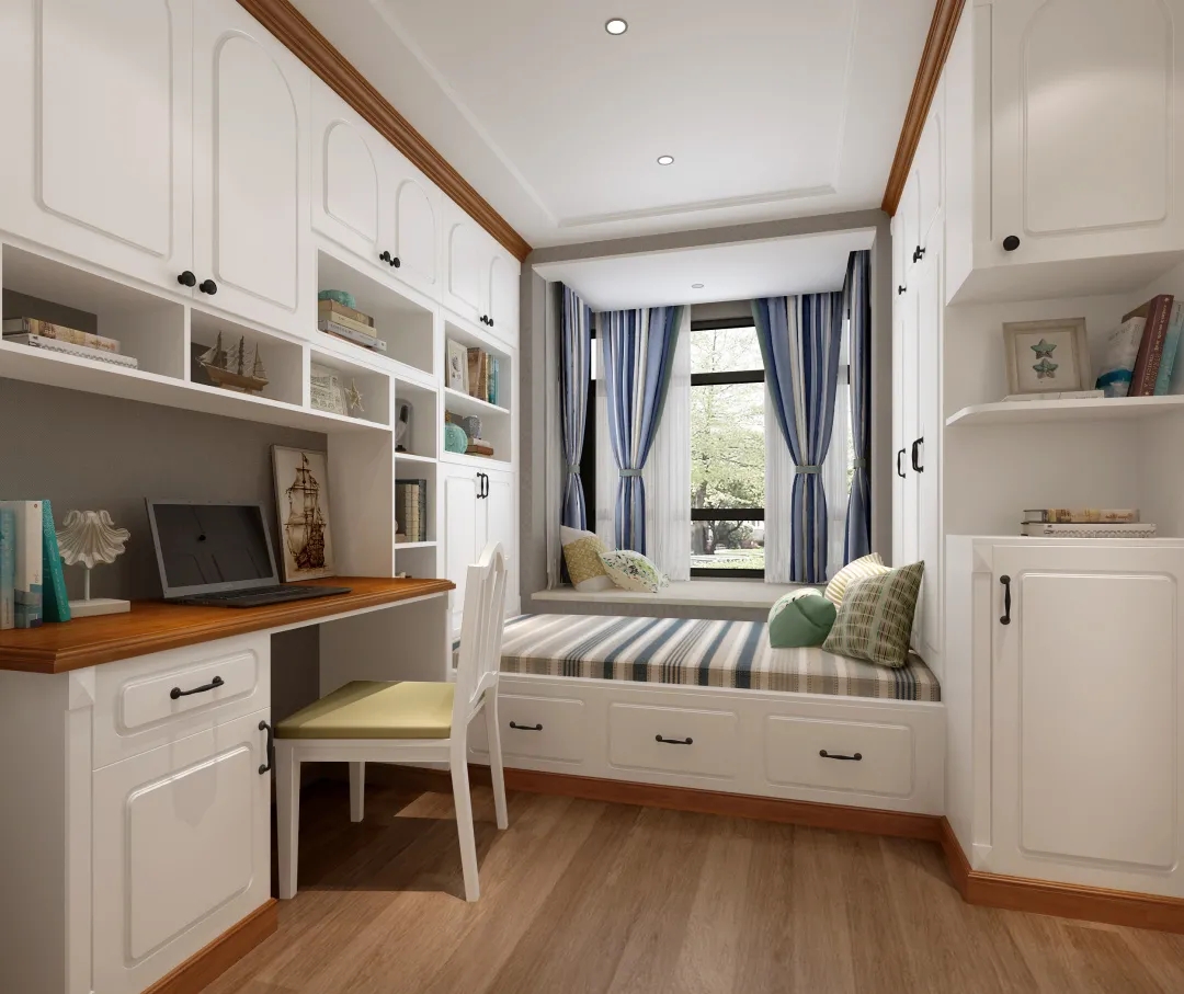 YOYO建議沿墻邊定制L型榻榻米+書桌組合,留出更多的活動空間。一面墻定制為一體式書桌柜,可辦公、學習;另一邊打造為舒適休息區+衣物收納區,多重功能的設計,一站式搞定“玩學儲住”。