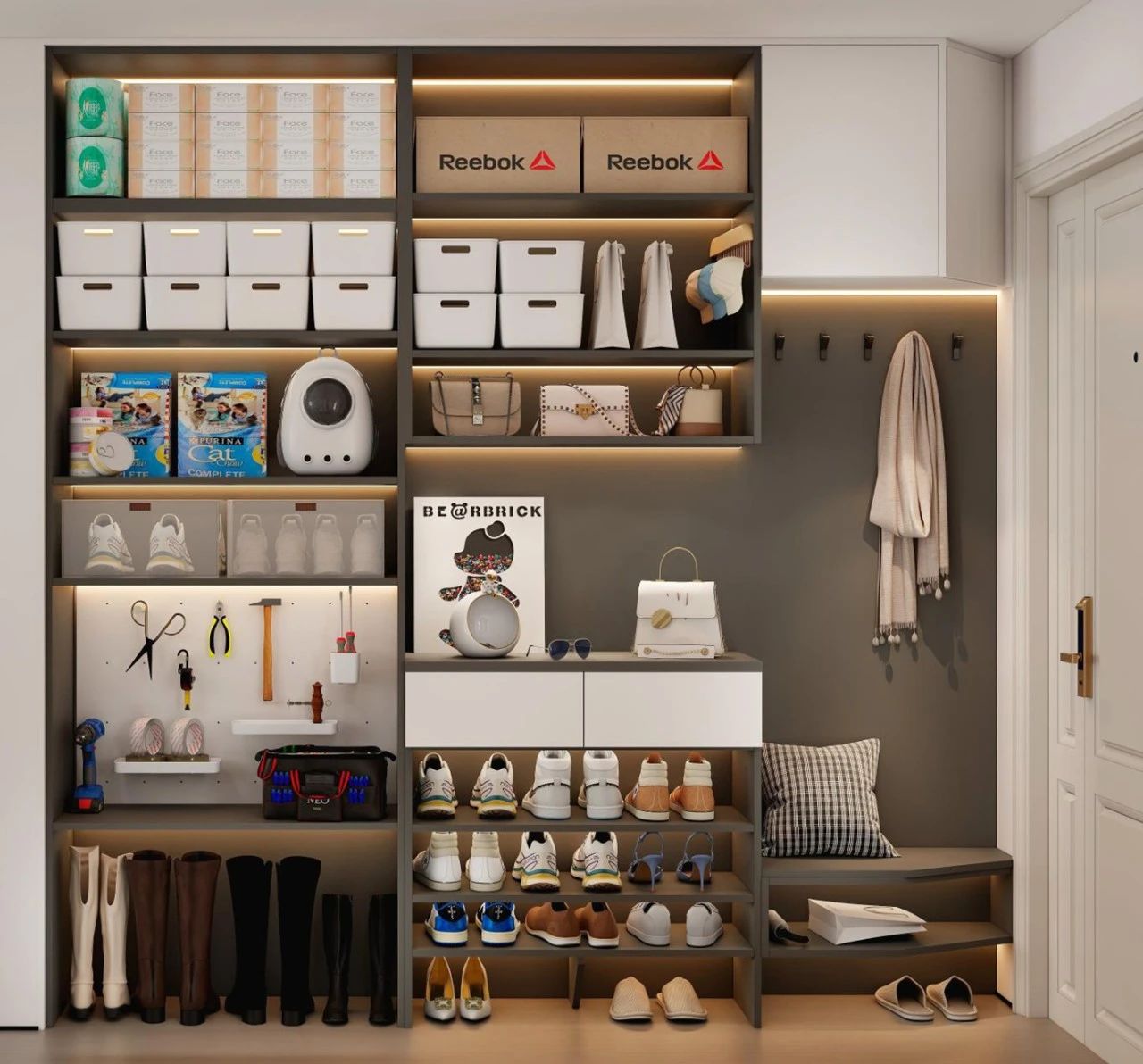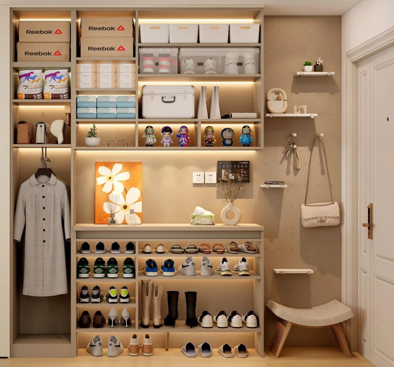 換鞋不用再蹲著或彎腰???♀?,上方還可以安裝洞洞板,掛日常通勤的衣服包包,井然有序
