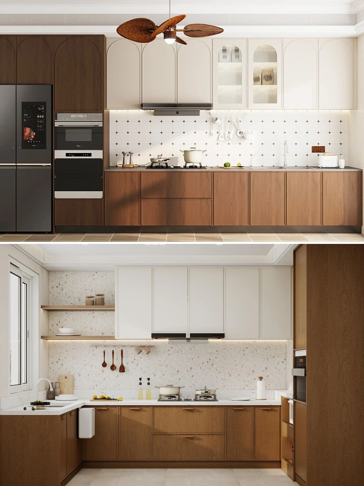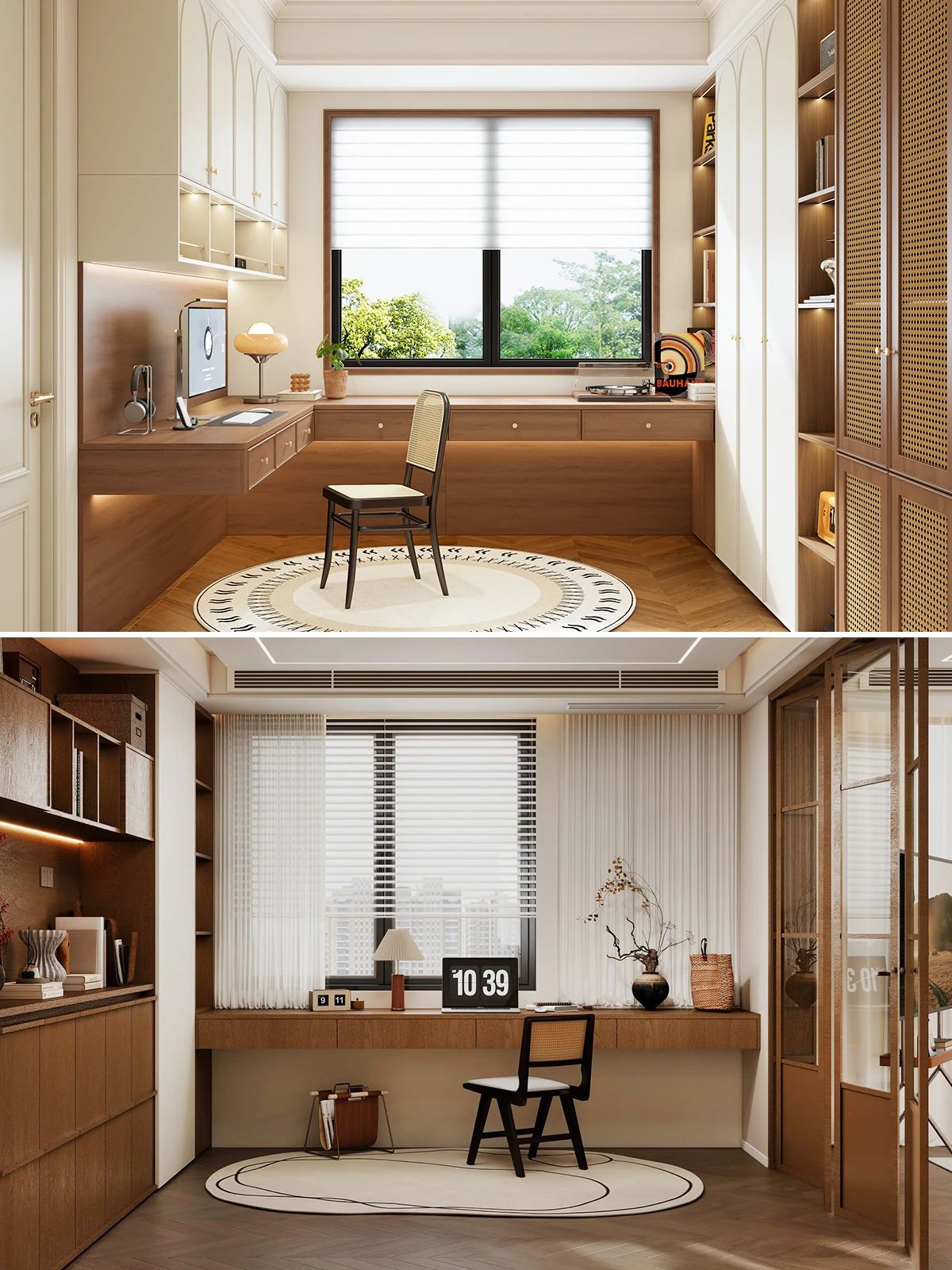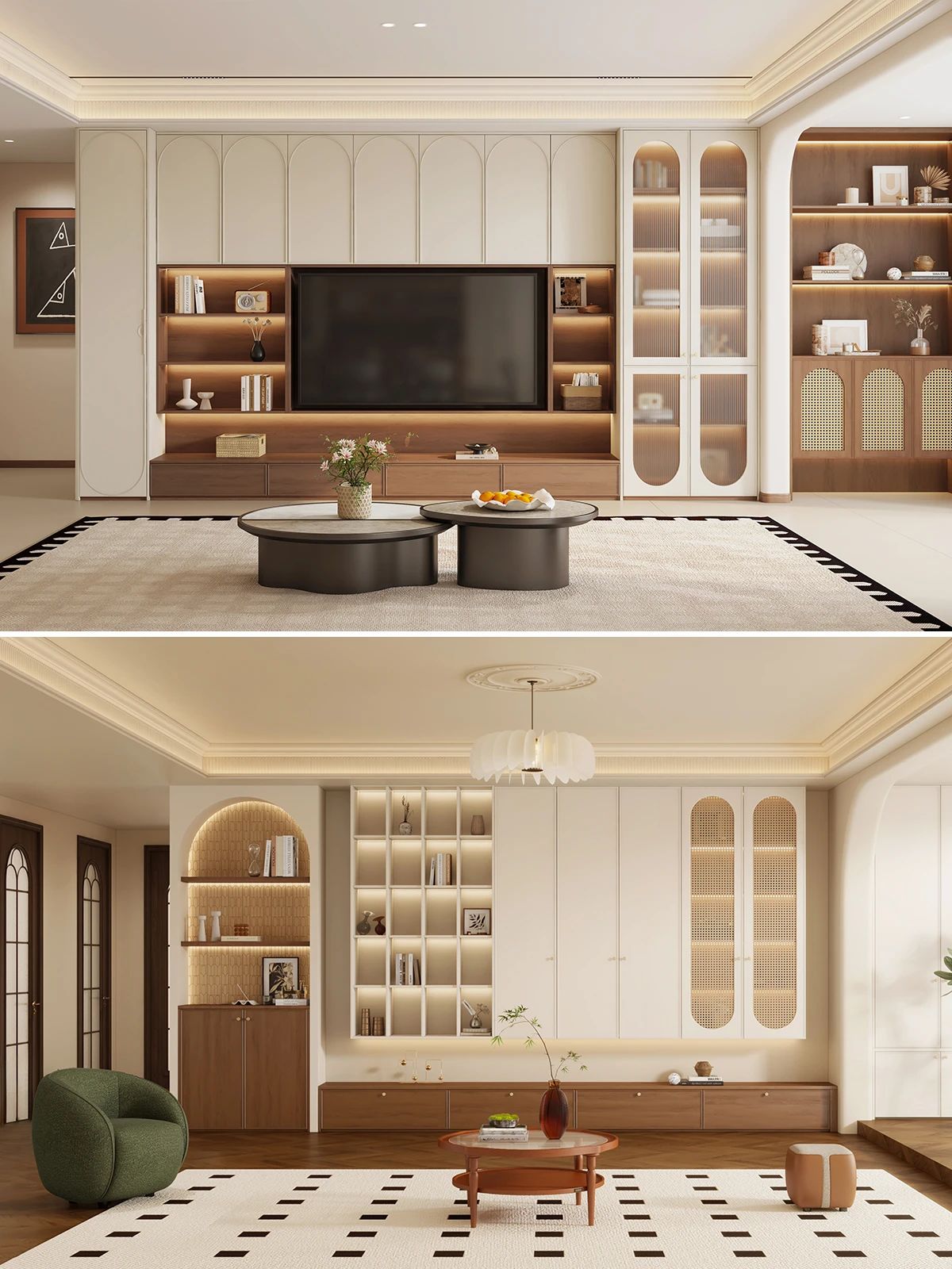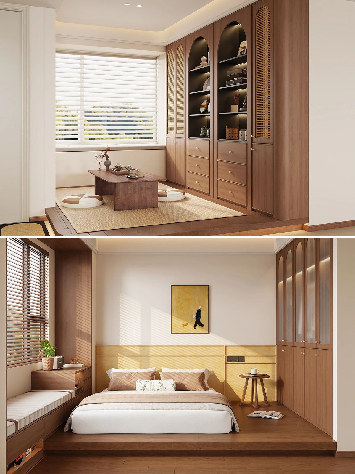 配色上,中古風定制柜有兩大主流方案,一是淺色與木色搭配,二是全柜采用木色。如果選擇深淺搭配,要注意木色占比不宜過多,避免視覺上過于厚重?
