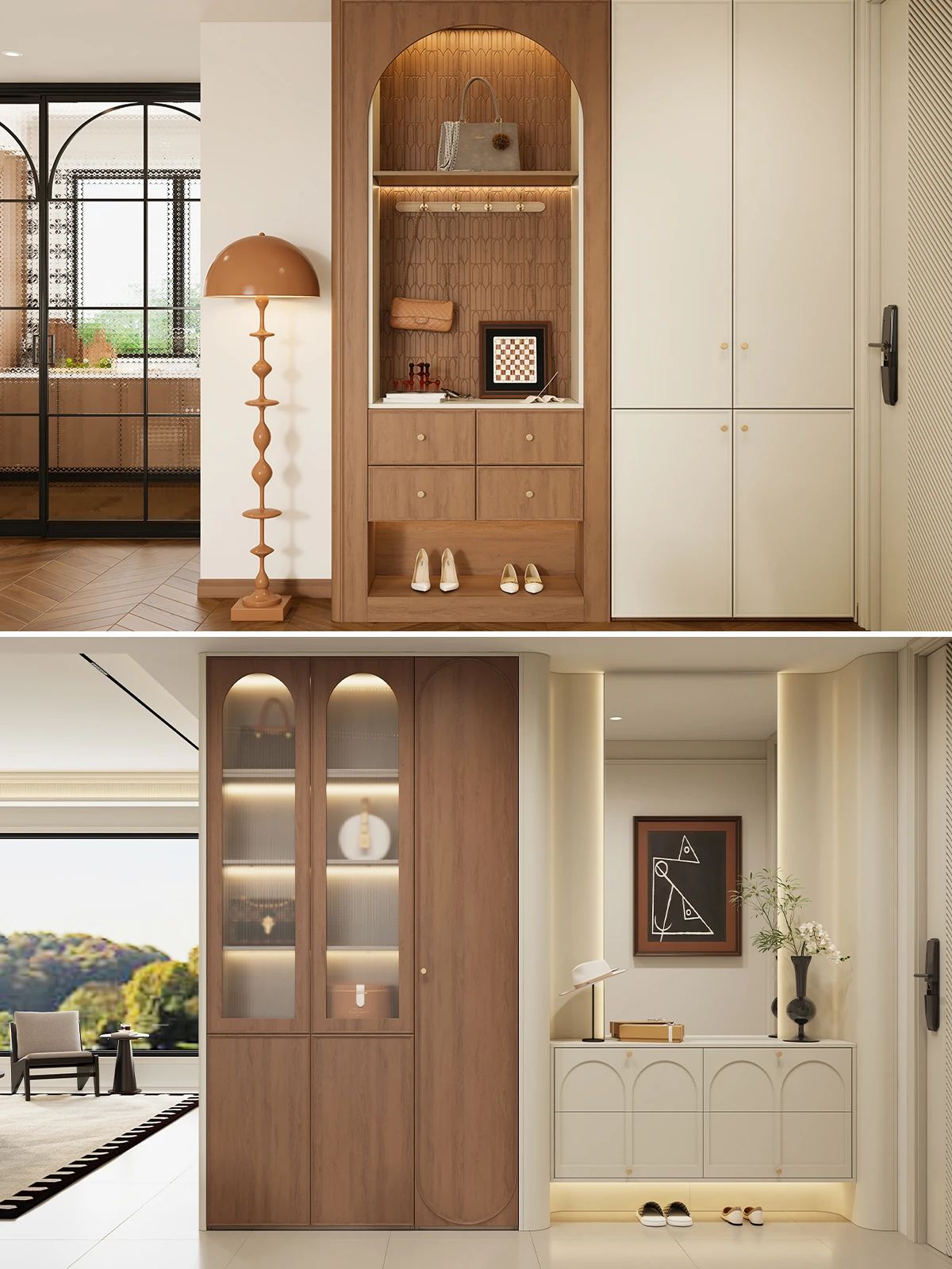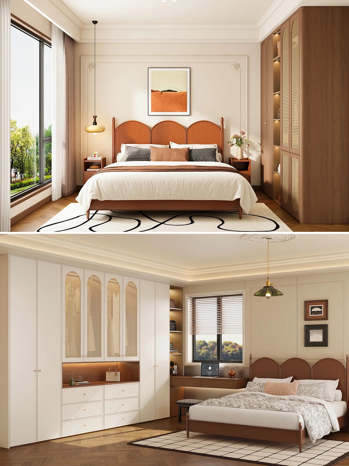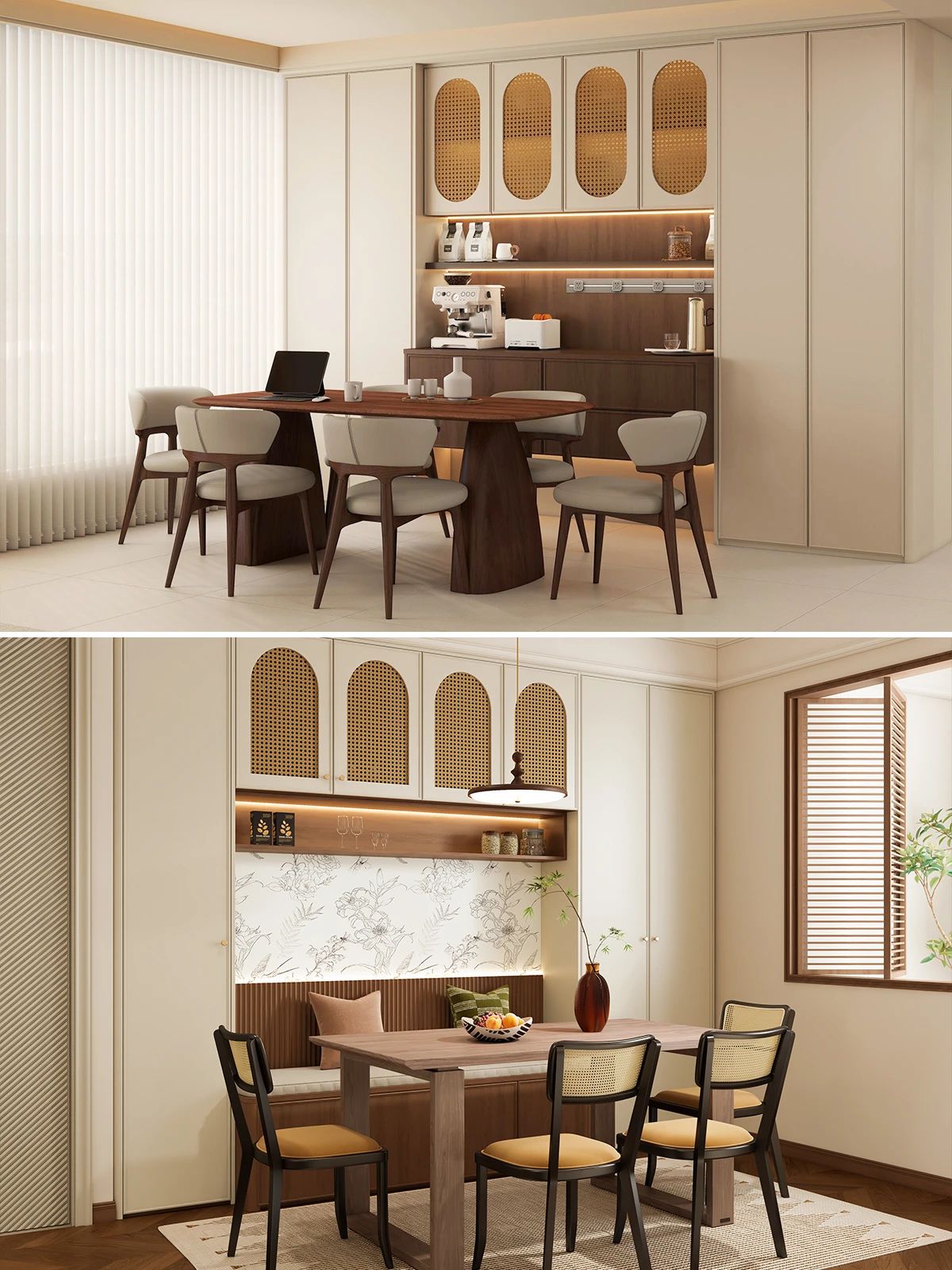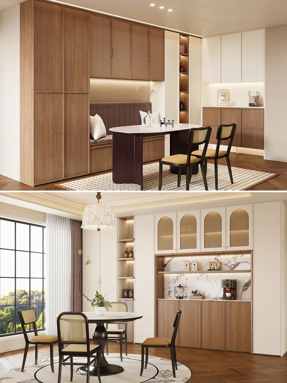 中古風定制柜想出彩,立體感是關鍵。柜門設計別單調,骨骼線勾勒輪廓,弧形元素增添柔和美感,藤編材質帶來自然質樸氣息??三者任選其一或組合,都能為柜子增彩?